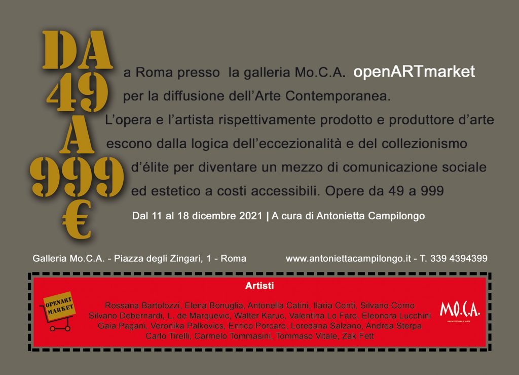 Openartmarket. Un' esposizione-mercato in cui l’opera e l’artista, rispettivamente prodotto e produttore d’arte, escono dalla logica dell’eccezionalità e del collezionismo d’élite, per diventare un mezzo di comunicazione sociale ed estetico a costi accessibile a tutti. A cura di Antonietta Campilongo