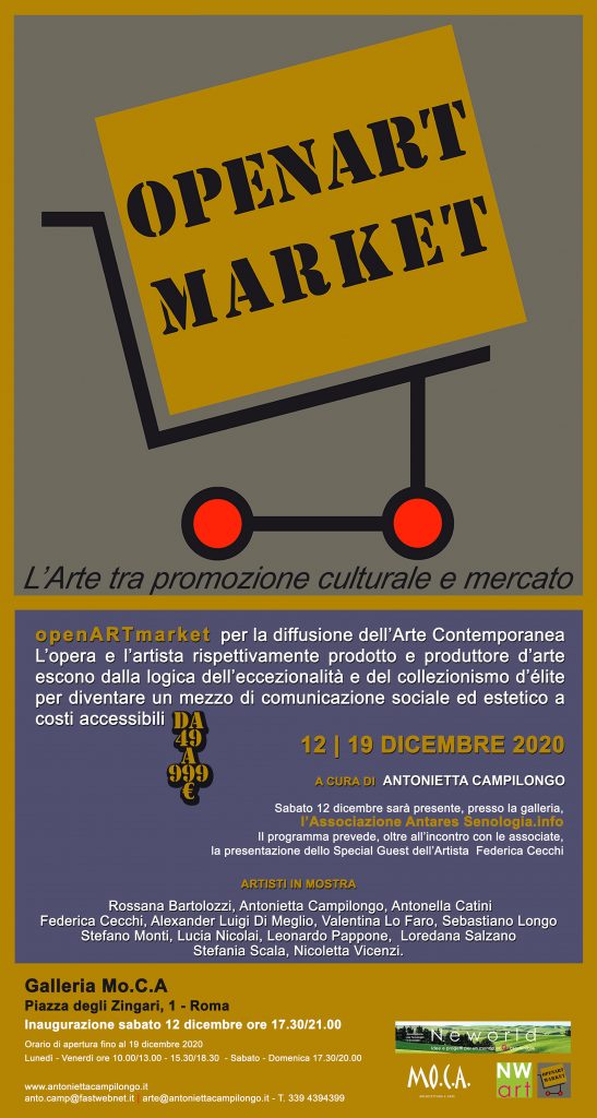 Si inaugura Sabato 12 dicembre 2020 alle ore 17.30 un nuovo appuntamento, il XXV, di OpenARTmarket, progetto a cura di Antonietta Campilongo, fino al 19 dicembre, presso la Galleria Mo.C.A. – Piazza degli Zingari, 1 - 00184 Roma