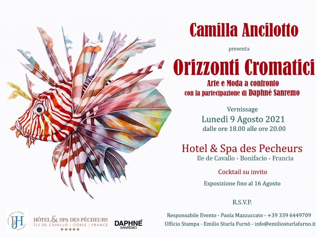 “Arte e Moda si fondono, a dimostrazione che la prima può essere non solo osservata ma anche indossata” – sottolinea Ancilotto – “In collaborazione con l’Atelier di Haute Couture DAPHNÉ Sanremo, abbiamo immaginato una collezione a 4 mani, a tiratura limitata di pregiati foulard disegnati e dipinti con soggetti affascinanti e colorati: colibrì che danzano in volo tra le peonie selvatiche, pesci leone dalle pinne sgargianti, nautilus tra gli anemoni di mare e gli uccelli del Paradiso tra gli ibiscus”. Una collaborazione artistica frutto del savoir faire di due eccellenze.