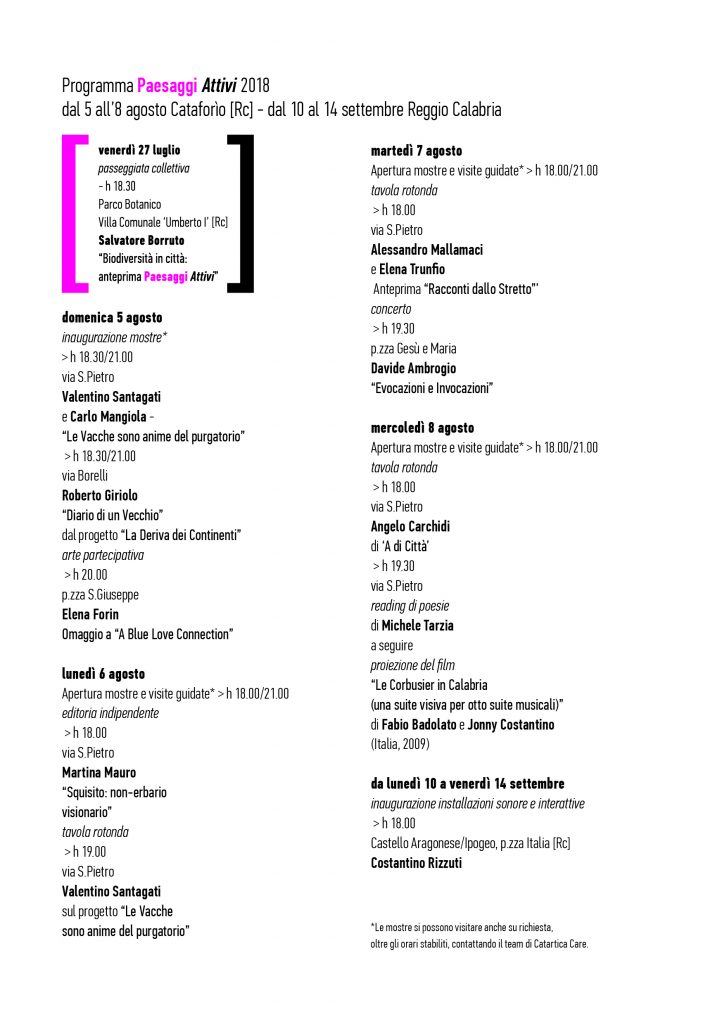 8 agosto, Cataforìo: Tavola rotonda per un dialogo e scambio di vedute insieme a una giovane ma già importante realtà operante nel settore culturale in Calabria, con uno sguardo rivolto allo studio e alla rivalutazione e rigenerazione di un paesaggio periferico, tra progetti editoriali e azioni collettive: A Di Città (Rosarno - RC) con Angelo Carchidi. / Reading di poesie e proiezione del film Le Corbusier in Calabria “una suite visiva per otto suite musicali” (2009) di Fabio Badolato e Jonny Costantino. L’incontro, a cura di Michele Tarzia, è titolato Il paesaggio immaginato: una visione introspettiva del paesaggio dell’anima, osservato e letto attraverso i sentimenti della natura e delle sue evocazioni. È il paesaggio che viviamo, che indaghiamo, che cerchiamo di cambiare. Attraverso la poesia e il cinema il nostro punto d’osservazione cambia e con esso anche il nostro modo di vivere, di vedere e percepire delle emozioni.