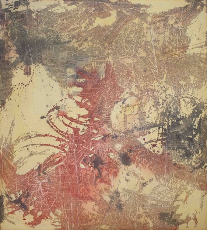 Il demiurgo Guerri parte dal caos, dalla macchia informale su tela grezza non lavata e idrorepellente. Qualcosa aderisce, si attacca,…