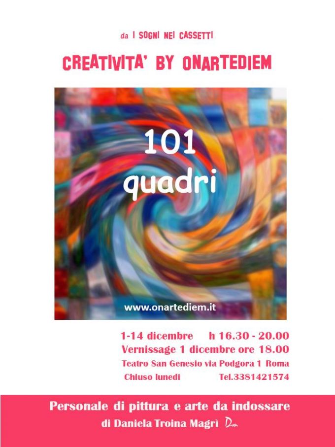 Personale di pittura e arte da indossare di Daniela Troina Magri Vernissage venerdì 1 dicembre alle ore 18,30 Ingresso libero…