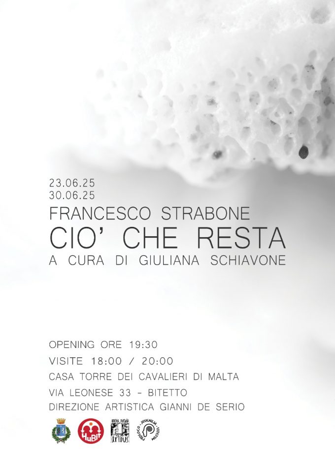 FRANCESCO STRABONE “CIÒ CHE RESTA” Mostra personale a cura di Giuliana Schiavone Casa Torre dei Cavalieri di Malta Via Leonese…