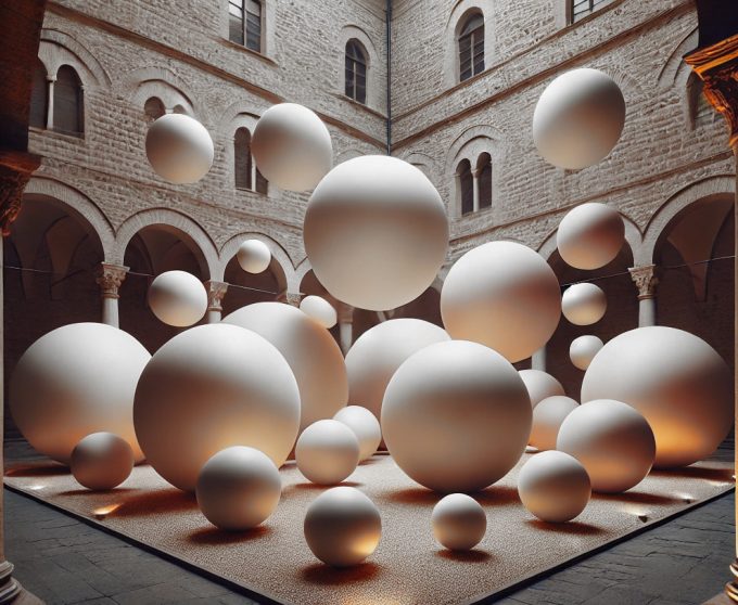 L’installazione si sviluppa nello spazio suggestivo di Palazzo Gualtiero, dove grandi sfere dalle forme, fluide e leggere, ci spingono oltre…