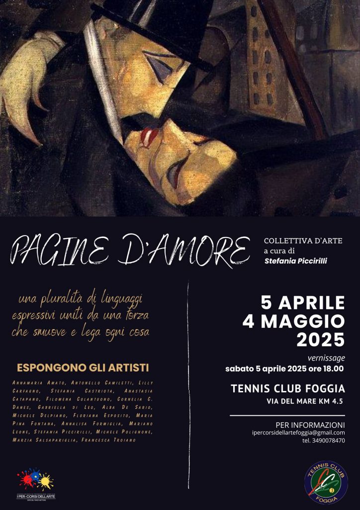 Dal 5 aprile al 4 maggio 2025, presso il Tennis Club di Foggia in via del Mare km 22, sarà possibile visitare una mostra delle opere degli allievi dei corsi di disegno e pittura dell'A.P.S. “I Per-corsi dell’arte” dal titolo "Pagine d’amore".