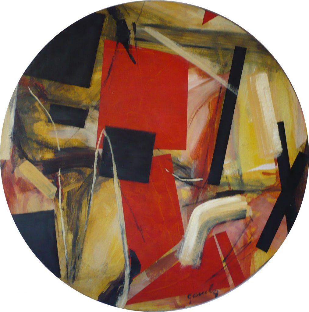 La pittura di Paola Gamba scaturisce da un’originale e inquieta sintesi tra un’esigenza apollinea di ordine e organizzazione dello spazio visivo e impulsi dionisiaci che producono guizzi di colore, segni, macchie, accensioni improvvise di luci endogene che ne scardinano la rigidità. Tra questi due opposti si gioca la partita dell’artista vicentina: in alcuni casi (…) a prevalere è, più o meno decisamente, l’astrazione geometrica; in altri casi (…) è l’Informale ad imporsi: una pittura gestuale, con connotazioni fortemente emotive. La gran parte del resto della produzione si colloca a mezza via, contaminando di volta in volta con soluzioni tecniche ed estetiche diverse approcci astratto-geometrici con altri informali. L’approccio apollineo affiora ogni qual volta la composizione appare costruita su assi ortogonali. (…) Tali griglie geometriche talvolta sono nette ed evidenti: si tratta di linee rette che delimitano superfici coperte da una stesura «pittorica» più o meno uniforme del colore, superfici che ci appaiono come quadrati o trapezi che si staccano da fondi di diversi colori e talvolta si sovrappongono ad altri quadrati o trapezi più grandi o più piccoli. Altre volte tali forme geometriche sono solo vagamente alluse da ampie pennellate o spatolate di colore, senza un uso netto e rigido di linee di contorno.. In questo caso però l’approccio apollineo e razionale è contaminato da un’esecuzione più libera e gestuale, e dunque emotiva, dionisiaca. Altre volte ancora sono strappi o ritagli di carta velina, o cartone o di altro materiale comunque ritagliato o sagomato e sovrapposto a suggerire figure vagamente geometriche. Volendo utilizzare la metafora musicale diremo che tutto ciò determina il «ritmo» delle composizioni, mentre la musica vera e propria, la linea melodica è rappresentata dalla stesura e dalla combinazione dei colori, ma anche talvolta dal guizzare improvviso di segni grafici. La pittura di Paola Gamba è la danza di Apollo e Dioniso: una ricerca inquieta di un irraggiungibile equilibrio tra ragione e sentimento.