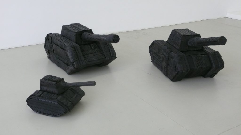 L’ambiguità delle opere di Canevari, sospese nella loro estetica brutale tra ironia e inquietudine, è emblematica della trasformazione sia concettuale che formale dei materiali industriali. Il petrolio e le sue applicazioni (gomma sintetica, olio motore di scarico, ecc.) sono al centro del suo linguaggio; nelle sue mani diventano simboli ambigui della violenza sistemica che permea il mondo in declino di oggi, dove la minaccia della guerra – in nome di valori spirituali e monetari – è incessante, e la memoria dell’umanità tragicamente troppo breve.