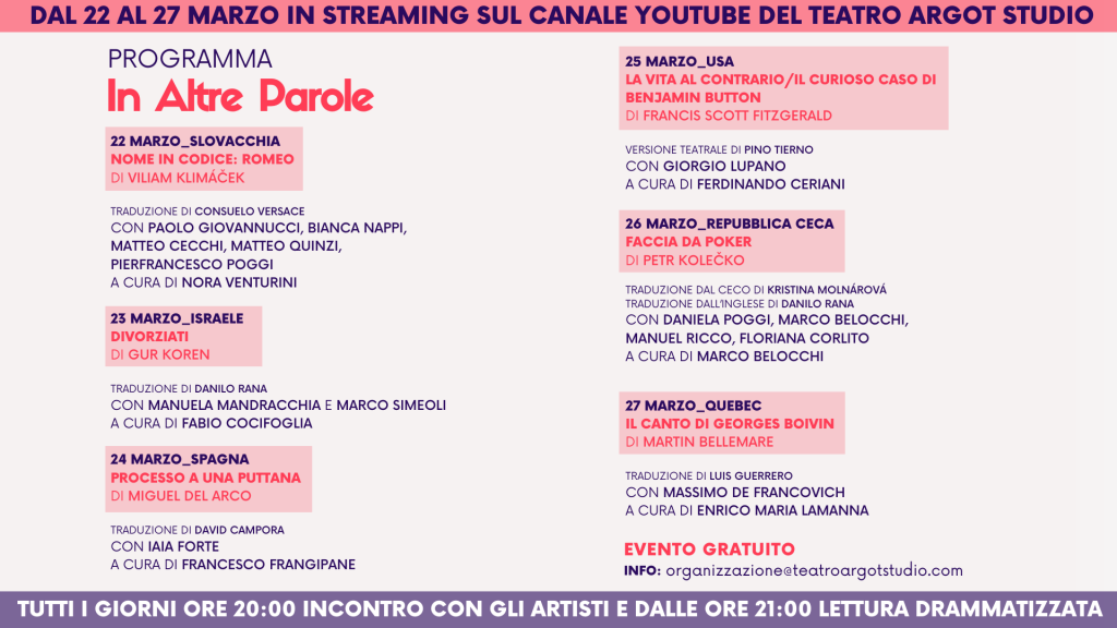 Tutte le notizie sulla rassegna In Altre Parole sono disponibili sul sito www.argot.it. Per ulteriori informazioni è possibile scrivere a organizzazione@teatroargotstudio.com.