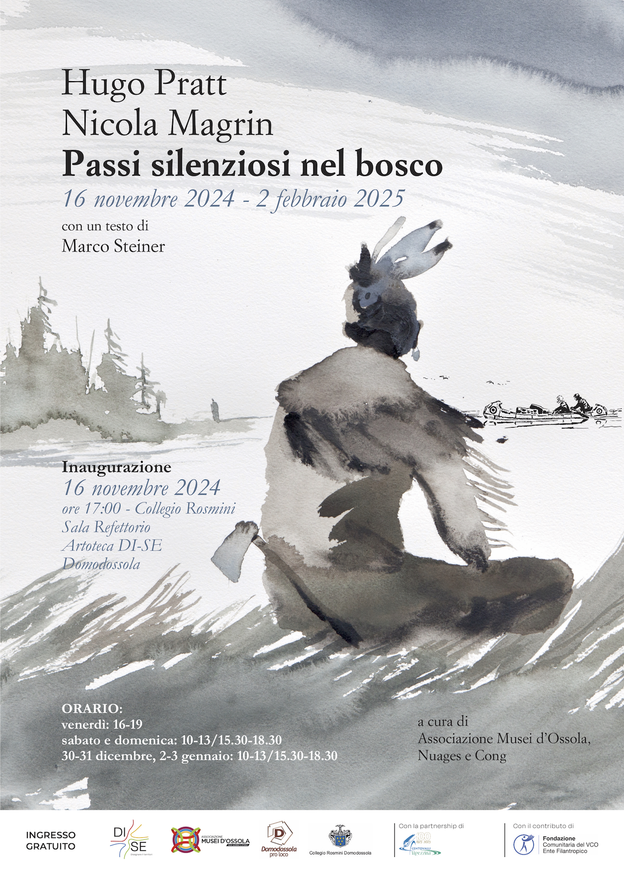 "Passi silenziosi nel bosco. Nicola Magrin incontra Hugo Pratt" è la grande mostra che abita da sabato 16 novembre (inaugurazione alle ore 17) al 2 febbraio 2025 l’importante sala del Refettorio del Collegio Mellerio Rosmini di Domodossola. Si inserisce nella seconda parte della quarta edizione del Festival dell’illustrazione Di-Se, Di-Segnare il territorio.
