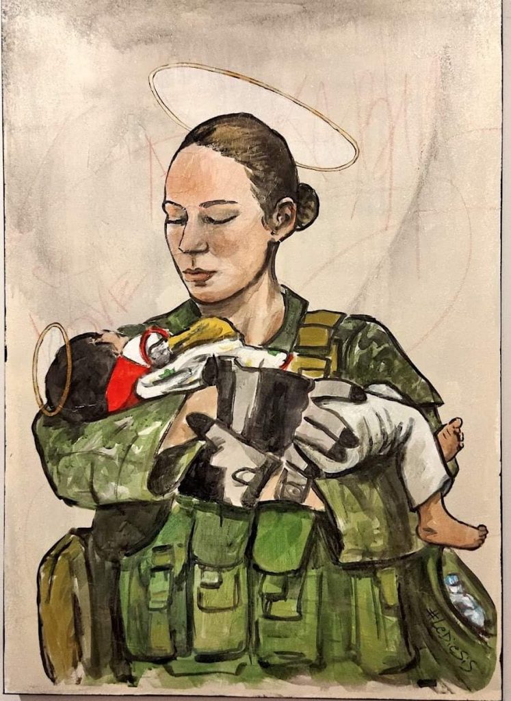 Pace, cura e lotta sono temi cari alle street artist Lediesis che dialogano con una grande bandiera multicolore realizzata nel 1953 dalle mezzadre in lotta per i diritti sul lavoro, riscoperta negli archivi della CGIL.