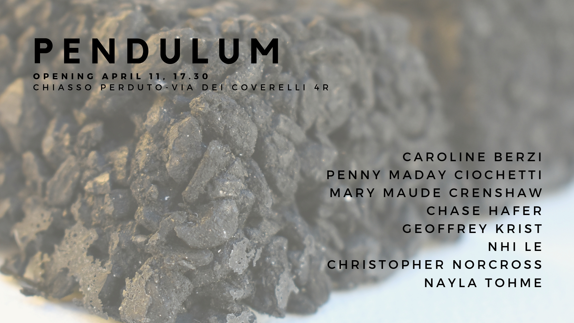 Il pendolo, le cui proprietà furono descritte per la prima volta da Galileo all'inizio del XVII secolo, fu il sistema più affidabile di misurazione del tempo fino all'avvento dell'era digitale. La sua oscillazione ipnotica, in condizioni ideali, segna il tempo perfetto con ogni oscillazione, eppure quando agisce anche con il minimo attrito, la costanza del pendolo viene interrotta. Attraverso i diversi media e linguaggi visivi, le opere di Pendulum rivelano una sfida comune al momento attuale, sollevando interrogativi sull'impatto della migrazione sull'identità personale, sui limiti dei sistemi culturali e politici di genere e il corpo, e spinta della tecnologia nel 21 ° secolo. Gli otto artisti protagonisti hanno trascorso gli ultimi 8 mesi a Firenze nel programma post-diploma di maturità presso la SACI: Caroline Berzi, Penny Maday Ciochetti, Mary Maude Crenshaw, Chase Hafer, Geoffrey Krist, Nhi Le, Christopher Norcross e Nayla Tohme.