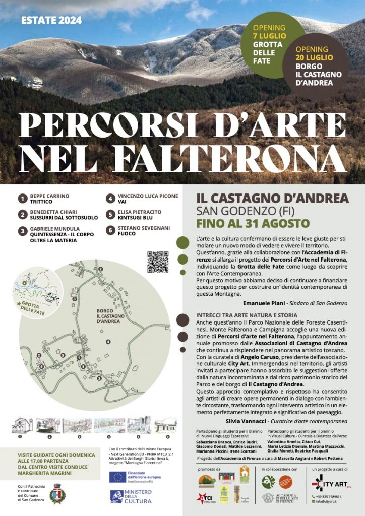 Il 20 luglio alle 17:30, invece, Percorsi d’arte nel Falterona presenta un'ulteriore iniziativa: il percorso d'arte nel borgo de Il Castagno d'Andrea. Curato da Angelo Caruso con il patrocinio del Comune di San Godenzo e la partecipazione della comunità ed enti locali, le opere permanenti degli artisti invitati – Beppe Carrino, Benedetta Chiari, Gabriele Mundula, Vincenzo Luca Picone, Elisa Pietracito e Stefano Sevegnani – saranno installate in stretta relazione con il borgo, creando un dialogo continuo tra arte e vita quotidiana.