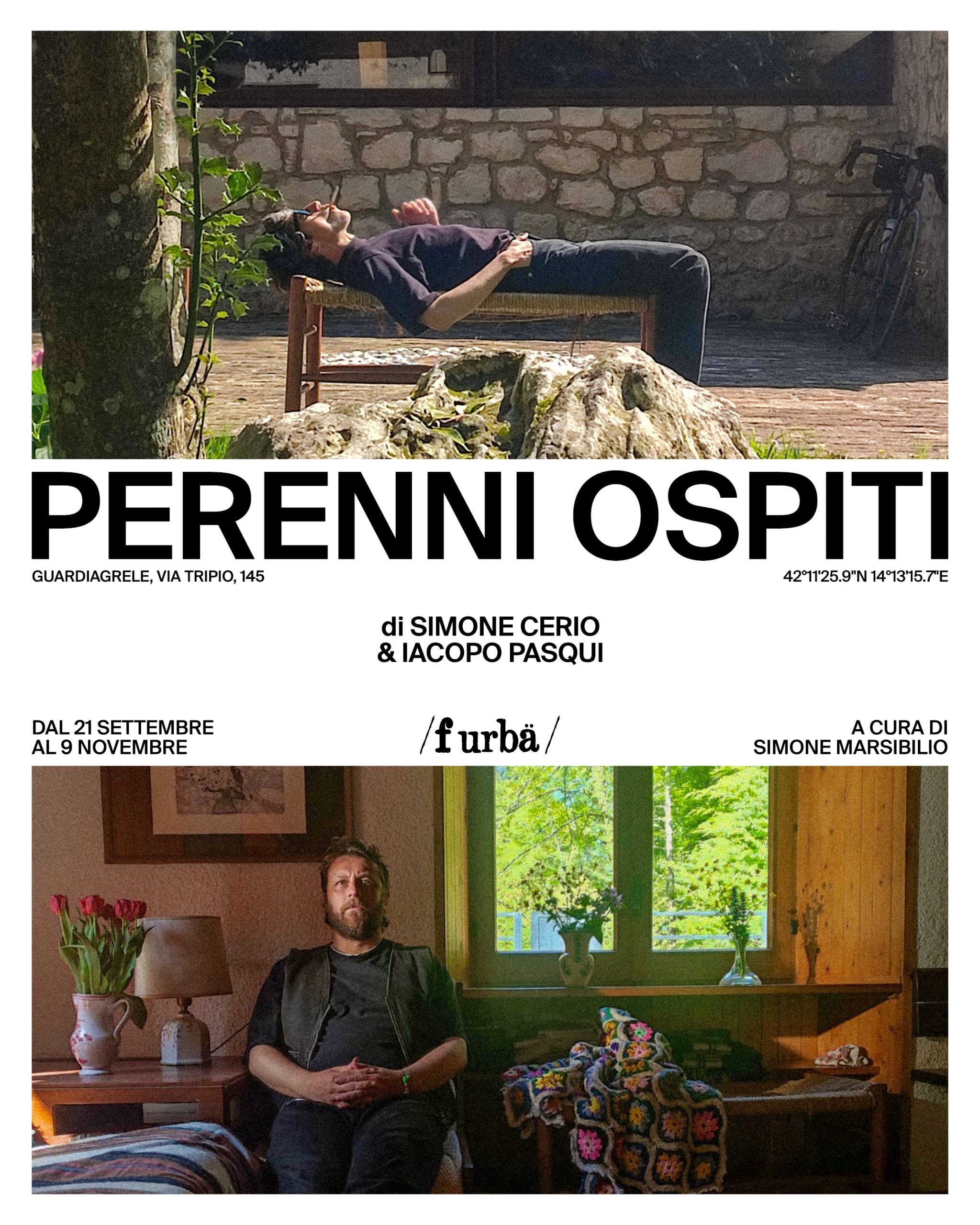 L’esposizione che si terrà a Guardiagrele, dal 21 Settembre al 9 Novembre 2025, nello spazio progettuale /f urbä/ a cura di Simone Marsibilio, si compone di una visione per immagini nella quale i due fotografi hanno indagato sulla e nella fotografia mettendo nello stesso piano tutti i processi, dandone eguale peso specifico. In questa occasione, il processo come punto di partenza ha portato relazione tra alcune fotografie (opere d’archivio) e i luoghi (abitazioni private nel quale i fotografi hanno avuto modo di conoscere e rapportarsi con i proprietari). Difatti, alcune opere degli autori che sono state mezzo di approfondimento di processo nella relazione tra spazio e fotografia, per arrivare poi alla fotografia finale, saranno presenti in un altro luogo, specificamente nella residenza Bocca di Valle sempre situata a Guardiagrele. Questo luogo sarà visitabile su appuntamento, oltre ad essere luogo di eventi correlati nel corso della mostra Perenni ospiti a /f urbä/.