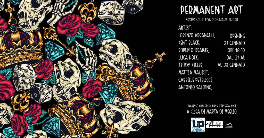 Venerdì 21 gennaio Up Urban Prospective Factory è lieta di presentare “Permanent Art”, mostra collettiva a cura di Marta Di Meglio dedicata al tattoo e ai diversi stili di questo linguaggio artistico contemporaneo. L’opening si svolgerà nella sede del progetto Up Urban Prospective Factory a Trastevere in Via dei Salumi 53.