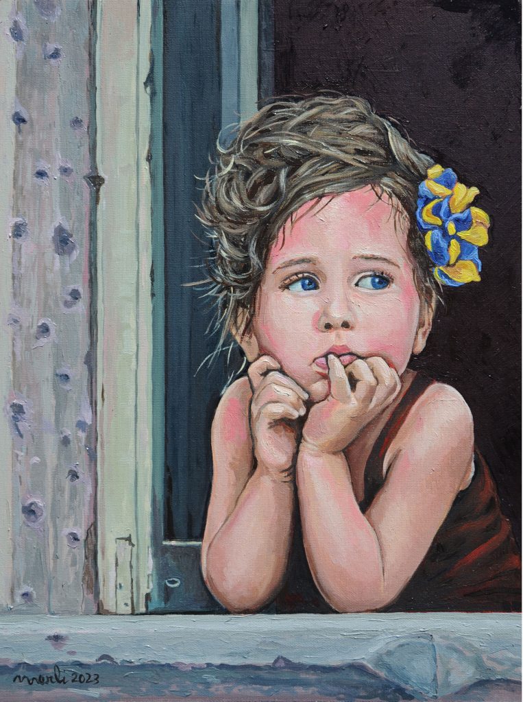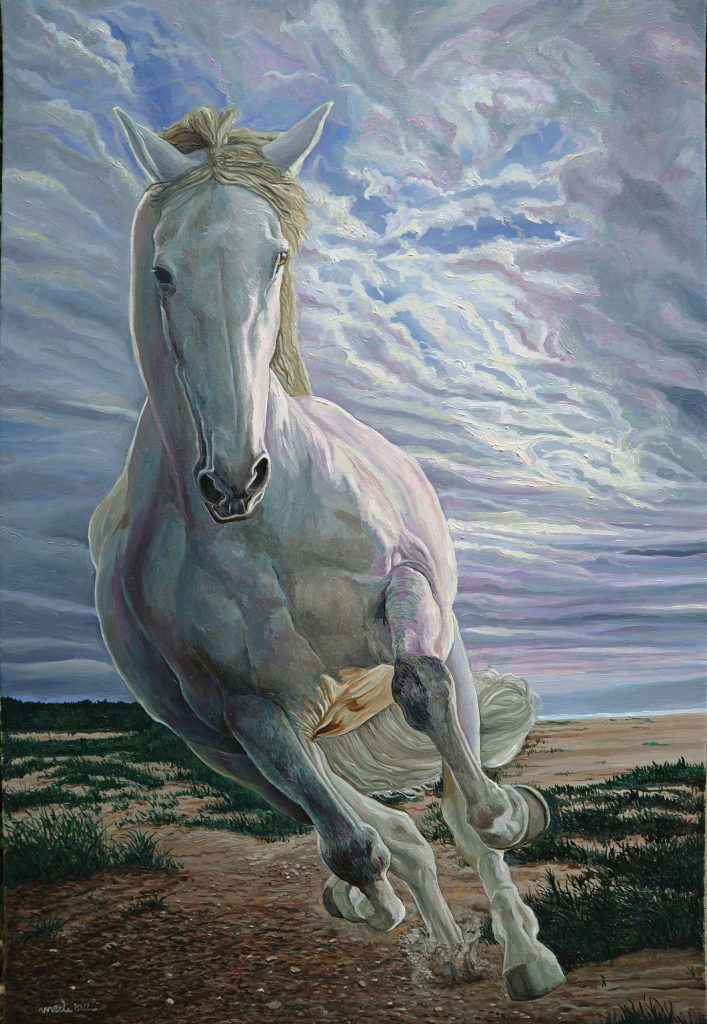Il racconto pittorico di ENRICO MERLI si avvale di una luce che sembra essere suscitata dallo stesso incedere del pennello sulla tela che si nutre dello stesso fare per una rappresentazione quasi teatrale. In “Sera a Portofino”, un olio su tela del 2022 si osserva la messa in scena delle case sul mare che dividono il paesaggio tra una immediata accensione di riverberi e un sognante retroterra. La stessa emozione e la stessa sorpresa si rinnovano in altri scorci che sorprendono Genova o il mutevole e declinante fascino di un prato (“Antola”). Anche in “Libertà” dello stesso anno le atmosfere del racconto (un cavallo in corsa che sembra voler bucare la tela verso l’osservatore) scaturiscono dallo stesso processo di sorpresa e di emozione. La sua è pertanto una scelta d’approccio che abbraccia tanto la natura quanto i sentimenti espressi dalle stesse immagini che parlano di persone: ce lo dice la bimba perplessa, protagonista de “La scolaresca che non c’è più”.