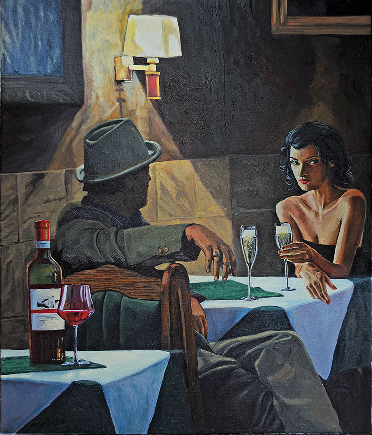 Enrico Merli affida la sua ispirazione principalmente a due temi: la figura umana e il paesaggio che comunque sovente si incontrano per un magico connubio. Egli infatti intinge le sue opere in un clima di sospensione estatica. Lo possiamo constatare nelle riflesse luci della sera che caratterizzano “Ganzirri” o in una “Chiavari” accarezzata dai bagliori dell’ultimo sole al tramonto. Anche “Il faro di Portofino” si avvale di una interpretazione che accoglie nell’anima di chi osserva le morbide seduzioni dell’imminente sera da condividere con “Tramonto a Punta Chiappa”. La scoperta di un tale palcoscenico emozionale viene quindi trasferita in particolari scene che offrono l’incanto di un momento: ci riferiamo in particolare al “Sogno condiviso” di due innamorati che contemplano il cielo stellato, un comportamento amoroso che ritroviamo nel mosaico incantevole di “Bonassola” e nell’alato “Magico incontro” che profuma di sogno. Perfino la trattenuta tristezza di “Matilde” è confortata dallo sguardo al miele della luna mentre “La bellezza salverà tutto” è un’auspicabile promessa esibita dalla leggerezza di una ballerina in tutù e in punta di scarpette che ha come sfondo uno scorcio di Lavagna.
