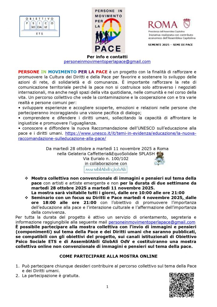 Ha preso avvio il progetto PERSONE IN MOVIMENTO PER LA PACE promosso e coordinato da Obiettivo Psico Sociale ETS per rafforzare e promuovere la Cultura dei Diritti e della Pace e contemporaneamente favorire e sostenere lo sviluppo delle azioni di rete, di solidarietà e di comunanza territoriale perché la pace non si costruisce solo attraverso i negoziati internazionali, ma anche negli spazi della vita quotidiana, nelle comunità e nel corso della vita incoraggiando una visione pacifica di dialogo.