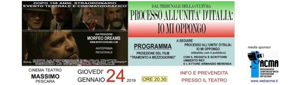 La Morfeo Dreams - con l’Associazione A.C.M.A quale media sponsor - organizza la proiezione del film “Tramonto a mezzogiorno” tratto dal libro “Il testamento di Don Liborio” di Umberto Rey presso il Cinema Teatro Massimo di Pescara giovedì 24 gennaio 2019 alle ore 20.30