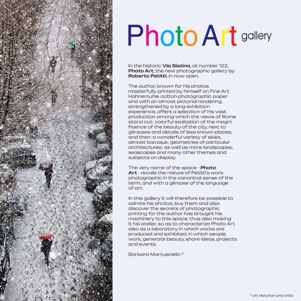 In questa galleria sarà possibile ammirare le foto di Petitti, acquistarle ed anche scoprire i segreti della stampa fotografica perché l’autore ha, in questo luogo, portato i suoi macchinari facendone quindi anche il suo studio, tanto da caratterizzare Photo Art come un laboratorio di bellezza, di lavoro e di idee.