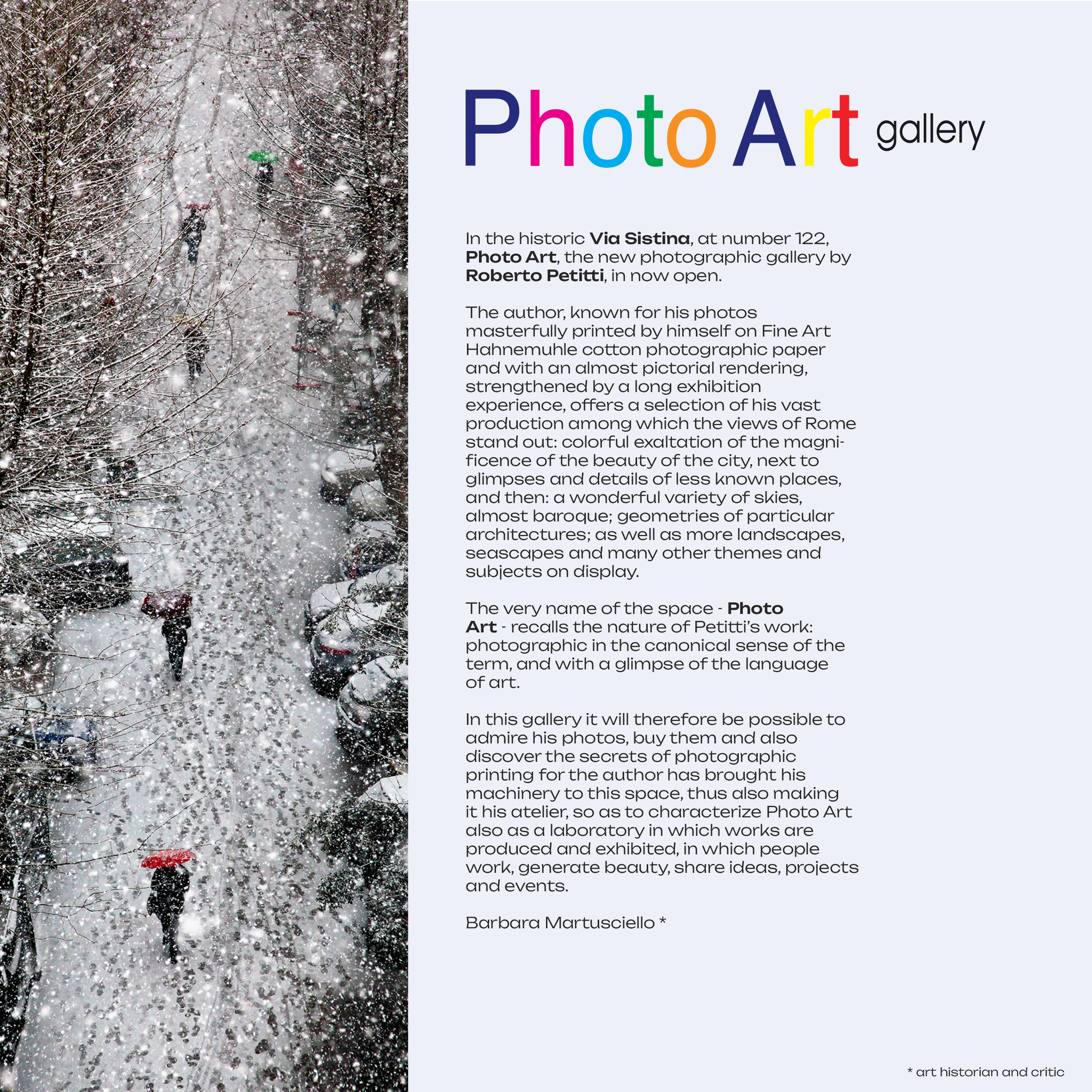 L’autore, noto per le sue foto magistralmente da lui stesso stampate su carta hahnemuhle e dalla resa quasi pittorica, propone una selezione della sua vasta produzione tra cui spiccano le vedute di Roma, colorate esaltazioni della bellezza della città, accanto a scorci e dettagli meno conosciuti, alla meravigliosa varietà dei cieli, quasi barocchi, alle geometrie delle architetture e a tanti temi e soggetti messi in mostra. Lo stesso nome dello spazio – Photo Art – richiama il carattere del suo lavoro: fotografico nel senso canonico del termine, e con uno sguardo al linguaggio dell’arte.