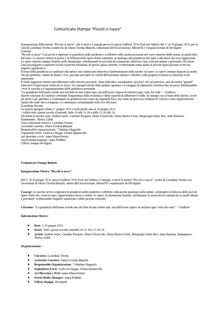 "Piccoli si nasce" è un invito a esplorare la grandezza nella modestia e a riflettere sulla nostra posizione nel vasto contesto della natura, in particolare del mare. La mostra celebra il potere e la bellezza delle opere d'arte contenute, in analogia alla grandezza del mare e alla forza che esso rappresenta.