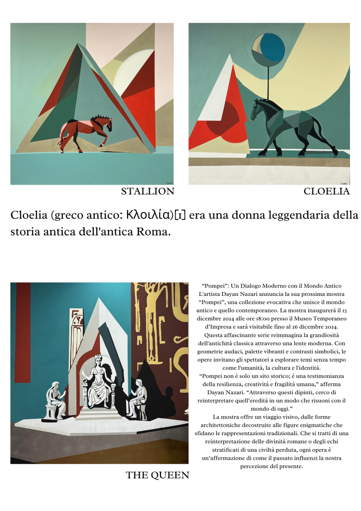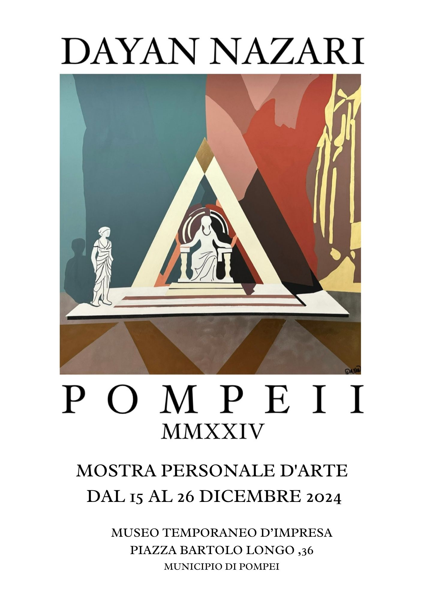 L'artista Dayan Nazari annuncia la sua prossima mostra “Pompei”, una collezione evocativa che unisce il mondo antico e quello contemporaneo. La mostra inaugurerà il 15 dicembre 2024 alle ore 18:00 presso il Museo Temporaneo d’Impresa e sarà visitabile fino al 26 dicembre 2024.