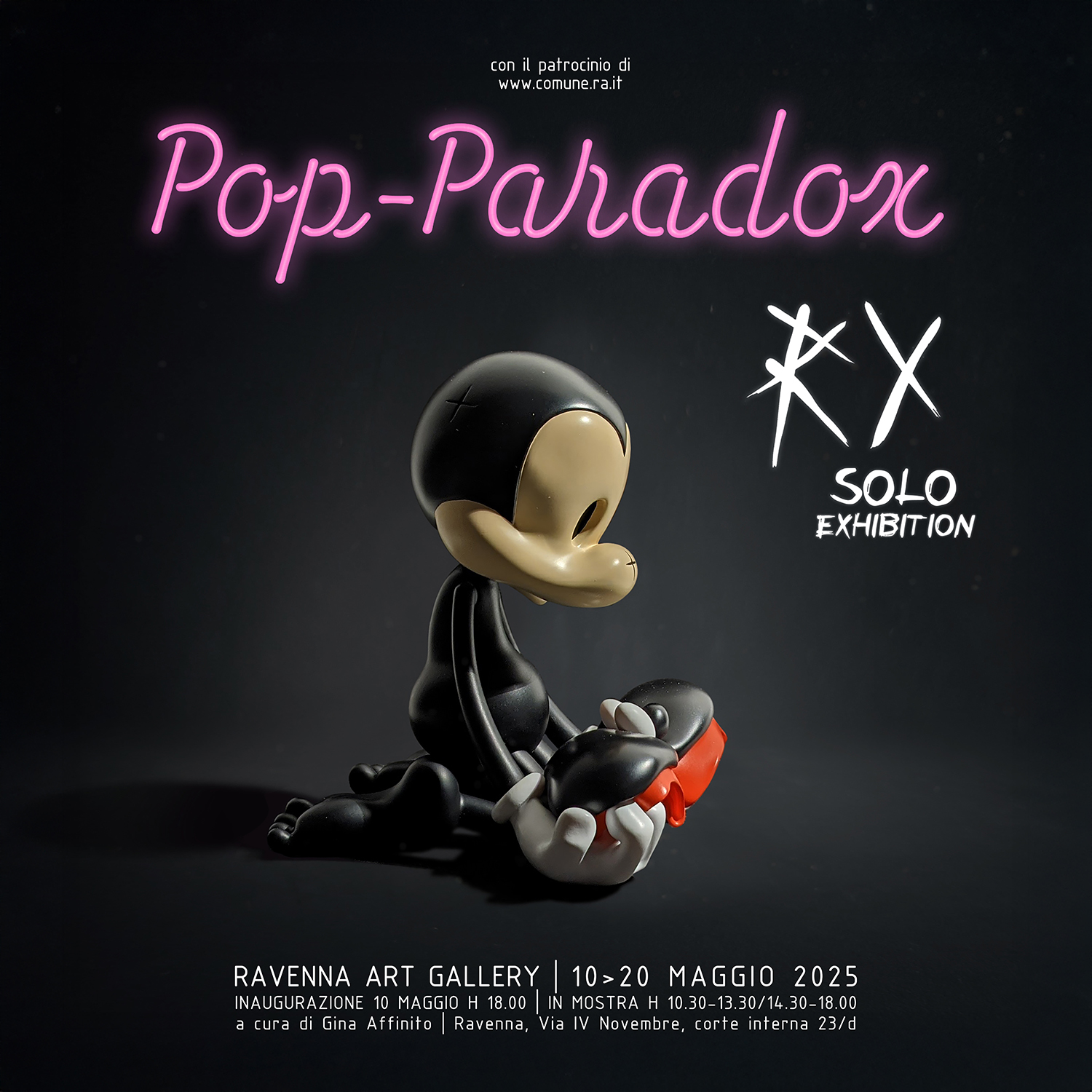 A cura di Gina Affinito, "Pop-Paradox" è affiancata da una seconda esposizione, "Pop-Innocence", che si pone come contrappunto lirico e concettuale alla personale di RX, arricchendo ulteriormente il dialogo tra estetica POP e riflessione critica.