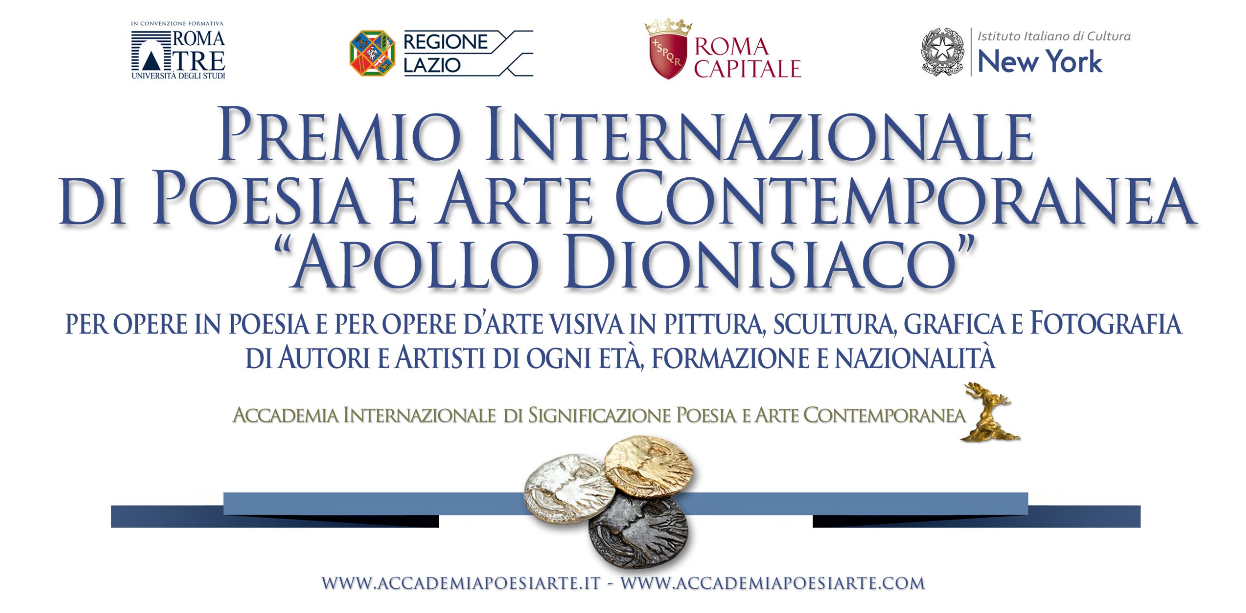 L'Accademia Internazionale di Significazione Poesia e Arte Contemporanea, polo no profit di libera creazione, formazione, ricerca e significazione del linguaggio poetico e artistico, in Convenzione formativa con l’Università degli Studi di Roma Tre, con il Patrocinio della Regione Lazio, di Roma Capitale e dell’Istituto Italiano di Cultura di New York, Presidente la prof.ssa Fulvia Minetti, bandisce la VI Edizione 2019 del Premio Accademico Internazionale di Poesia e Arte Contemporanea Apollo dionisiaco, senza scopo di lucro.