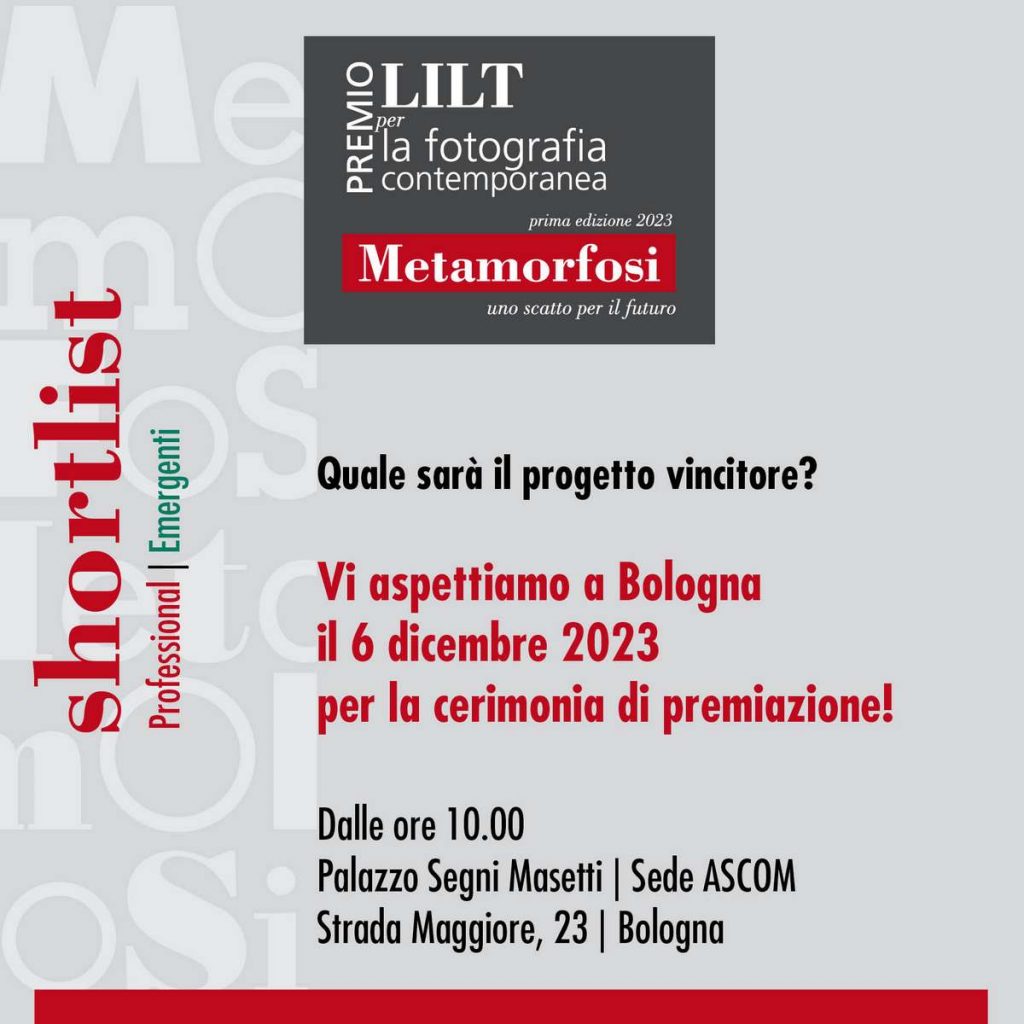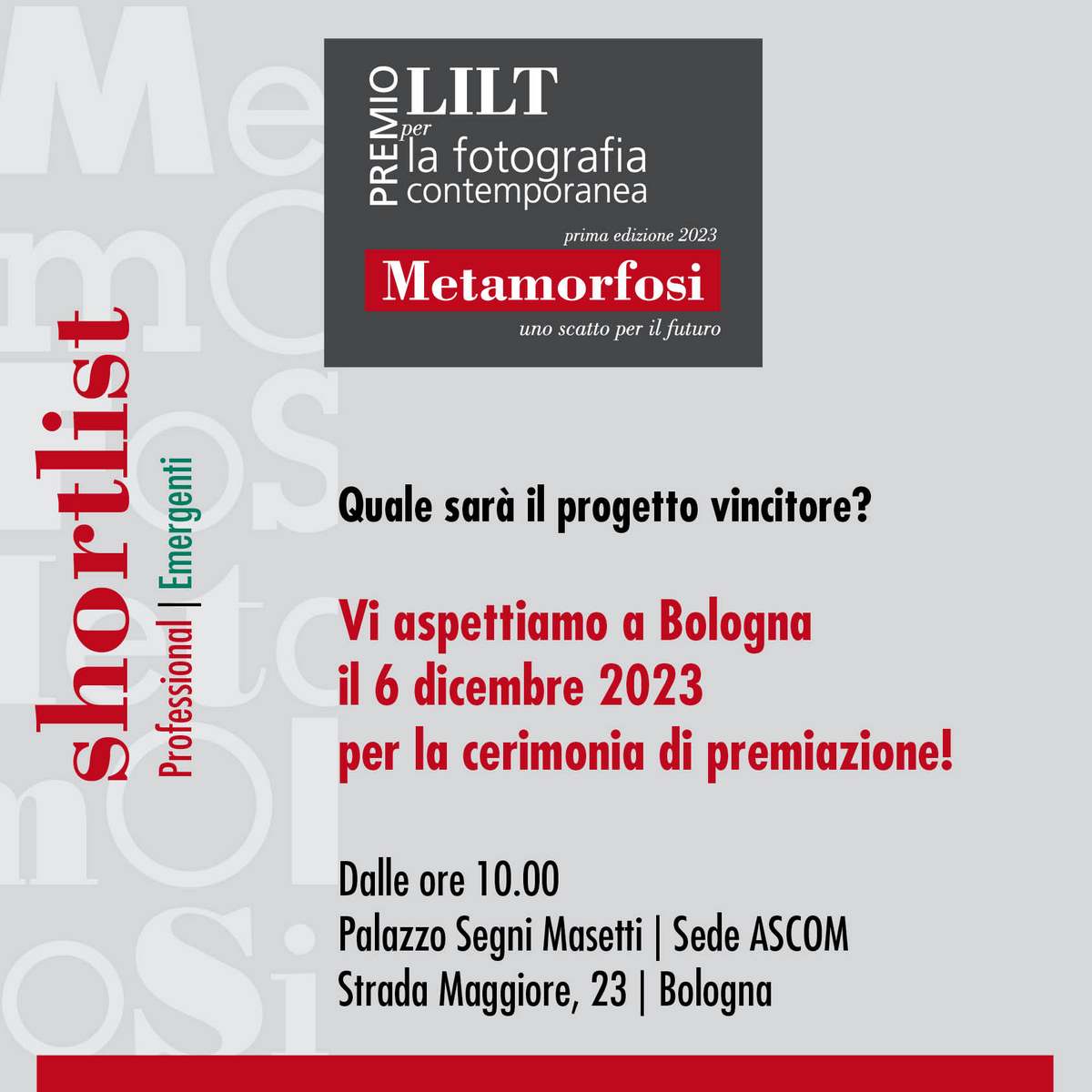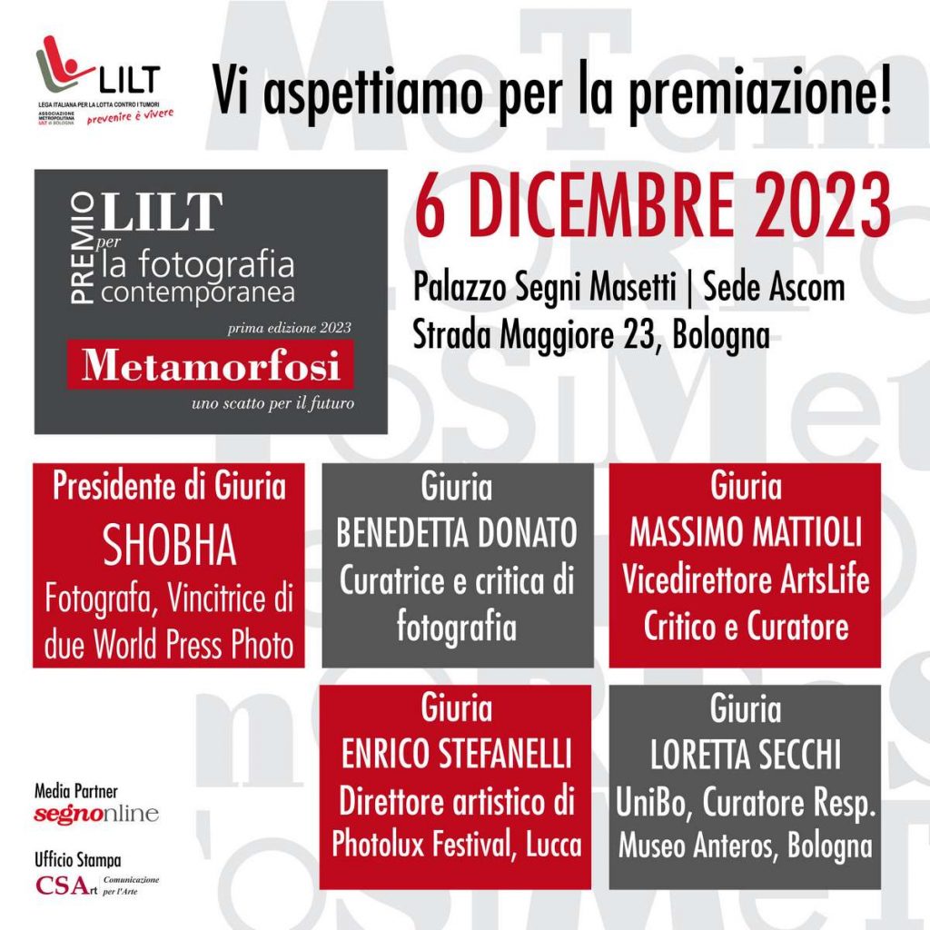 I vincitori della prima edizione del Premio LILT per la Fotografia Contemporanea saranno premiati mercoledì 6 dicembre 2023, alle ore 10.00, presso la Sede Ascom di Bologna, all’interno di Palazzo Segni Masetti, nell’ambito di una cerimonia aperta al pubblico.