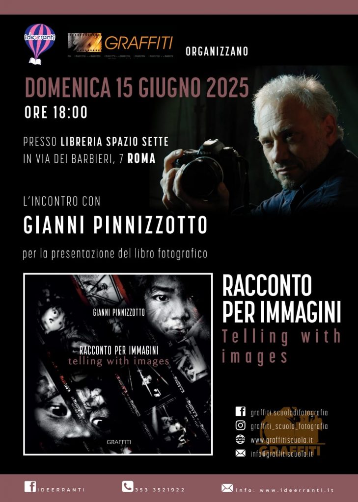 Nella splendida cornice della Libreria Spazio Sette a Roma, domenica 15 Giugno 2025 alle ore 18  si terrà, in collaborazione con l’Associazione Ideerranti, l’evento di presentazione del trentaduesimo libro della Casa Editrice GRAFFITI: "Racconto per Immagini", un’opera preziosa che riunisce alcuni tra gli scatti più significativi del fondatore e direttore, il Maestro Gianni Pinnizzotto.