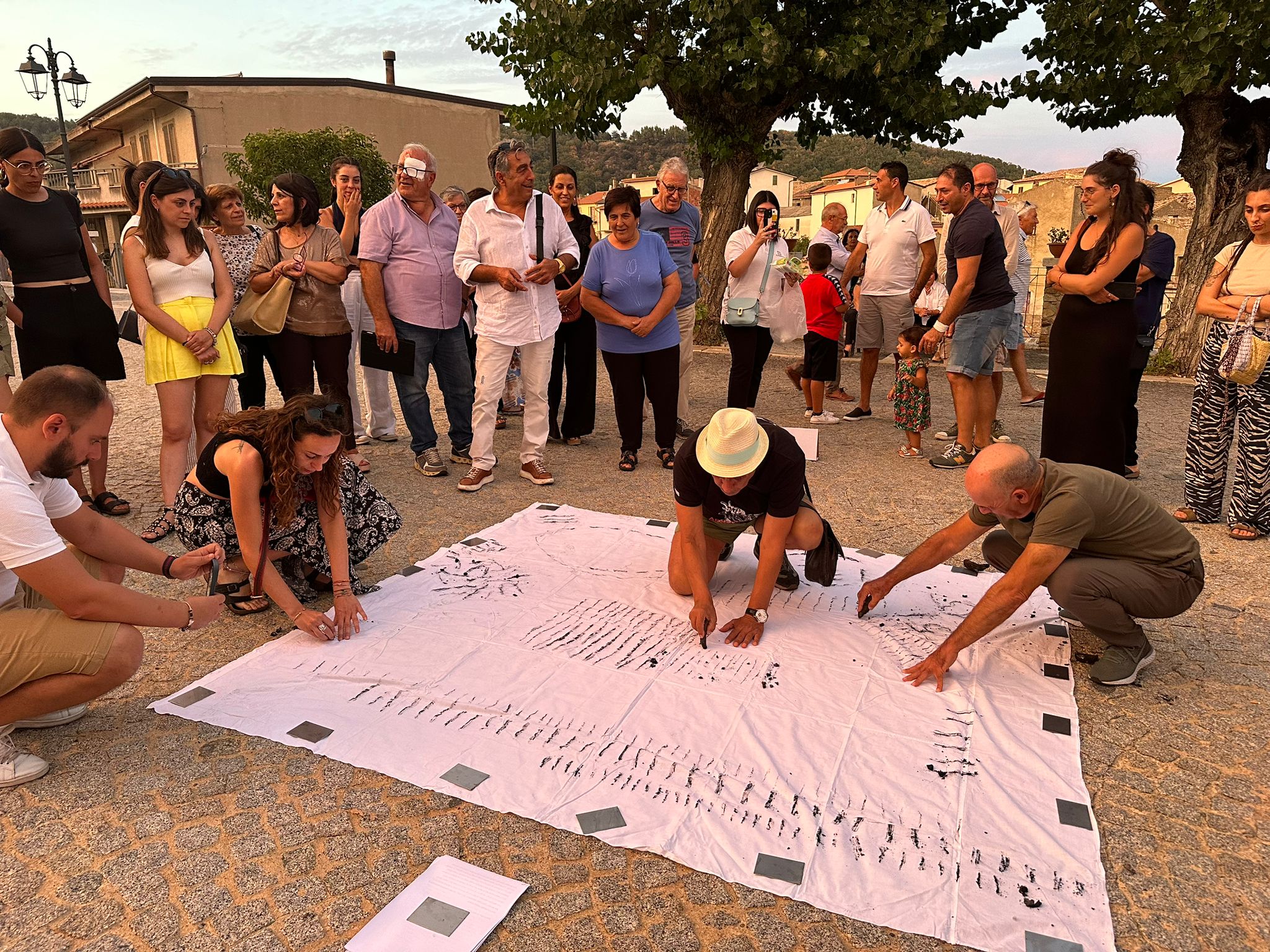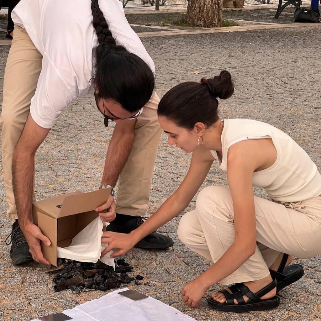 Un lenzuolo steso a terra è stato segnato dagli anni di chi è stato lontano, utilizzando legno carbonizzato degli incendi che hanno colpito la regione. Questi incendi, le cui cicatrici nere sono visibili sulle montagne, sono stati trasformati in segno tangibile della storia e della resilienza della comunità.