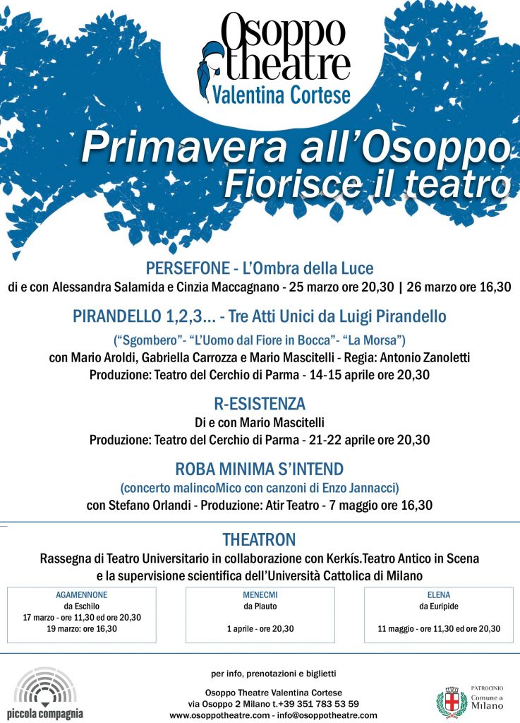 Riparte, con rinnovato slancio e un variegato cartellone di spettacoli, dai classici a proposte più contemporanee, il calendario dell’Osoppo Theatre di Milano, una nuova realtà culturale guidata dal direttore artistico Antonio Zanoletti, regista e attore che ha collaborato tra gli altri con Giorgio Strehler, Luca Ronconi, Claudio Longhi e Franco Branciaroli. Nella compagine direttiva dell’Osoppo Theatre anche l’attrice e formatrice Gabriella Carrozza, interprete iconica del Teatro del Cerchio di Parma.