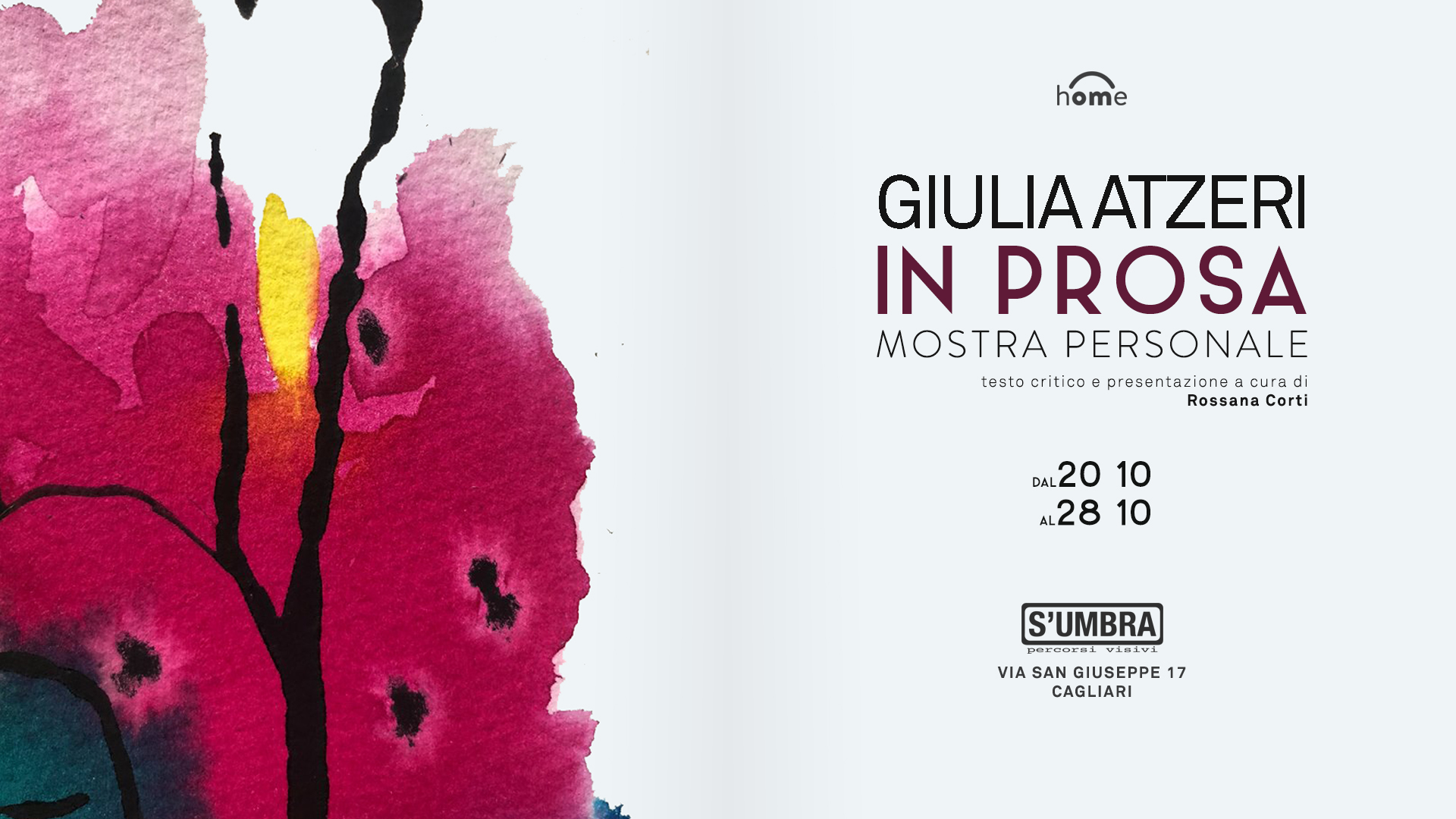 Per il Circuito hOMe di Urban Center inaugurerà il 20 ottobre 2018 alle ore 18 la mostra personale IN PROSA di Giulia Atzeri con presentazione e testo critico di Rossana Corti presso lo Spazio Sumbra Percorsi Visivi in via San Giuseppe 17 a Cagliari. Rappresentare le emozioni nate dalle parole, frasi e versi liberi, contenuti in undici/11 tra i libri fondamentali per la propria formazione esistenziale: questo ha scelto di fare l'artista Giulia Atzeri per la sua mostra IN PROSA, usando carta, tela e filo di rame per accogliere e racchiudere la pittura acrilica e a tratti scarnificarla insieme al supporto con segni incisi.