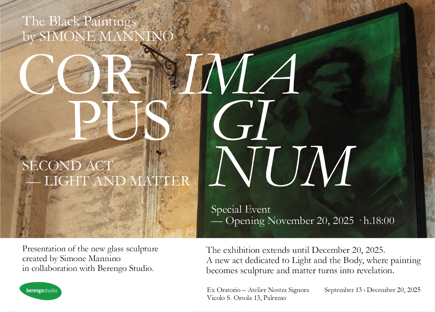 Il 20 novembre a Palermo si presenta la grande scultura in vetro Murano di Simone Mannino, realizzata con Berengo Studio. L’opera segna l’inizio del percorso verso Glasstress Venezia e inaugura il secondo capitolo della personale di Mannino “Corpus Imaginum” all’Ex Oratorio di Atelier Nostra Signora