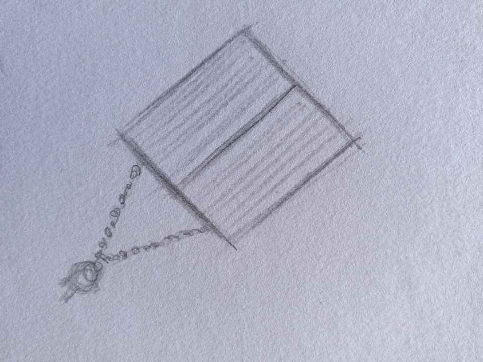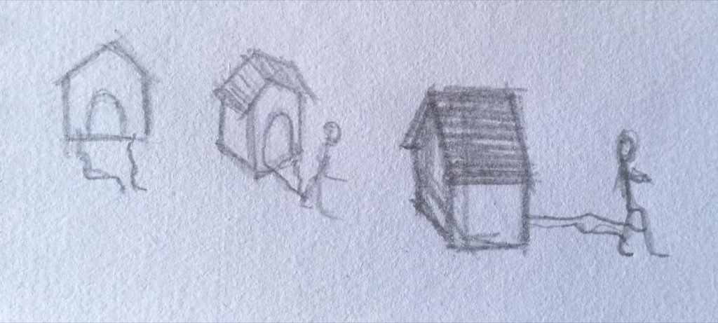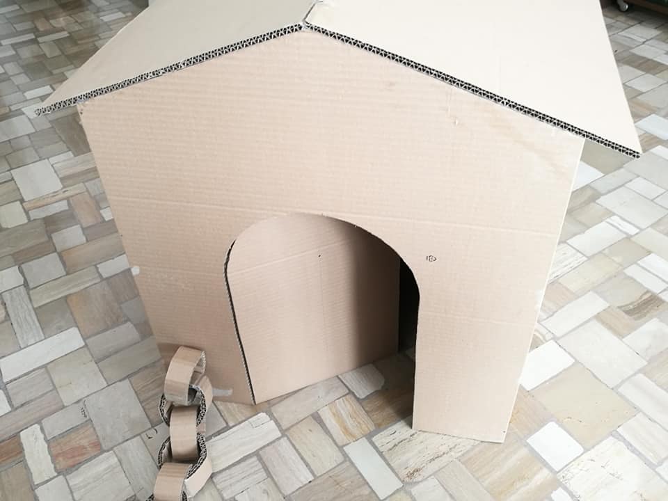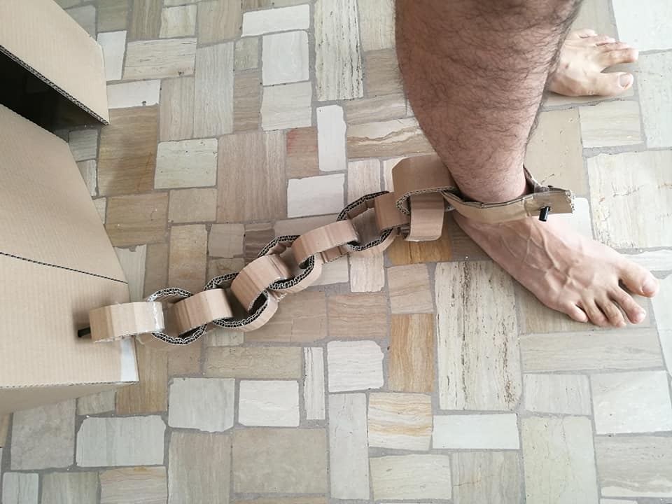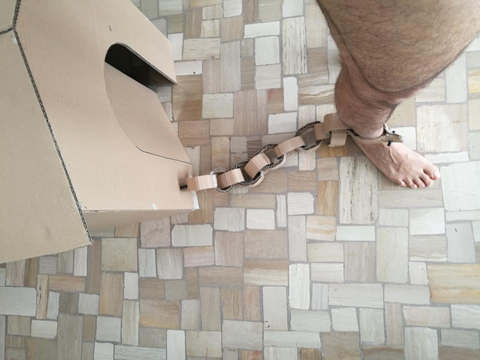 Una casa e una catena costruite di cartone, l’unico materiale che l’artista è riuscito a reperire.