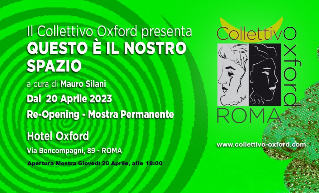 Da Giovedì 20 aprile 2023, a Roma presso lo spazio espositivo Q’4RT dell’Hotel Oxford in via Boncompagni 89, RE-OPENING della la mostra permanente dal titolo “QUESTO E’ IL NOSTRO SPAZIO”, inaugurata 11 novembre 2022, a cura di Mauro Silani. Apertura dalle ore 18