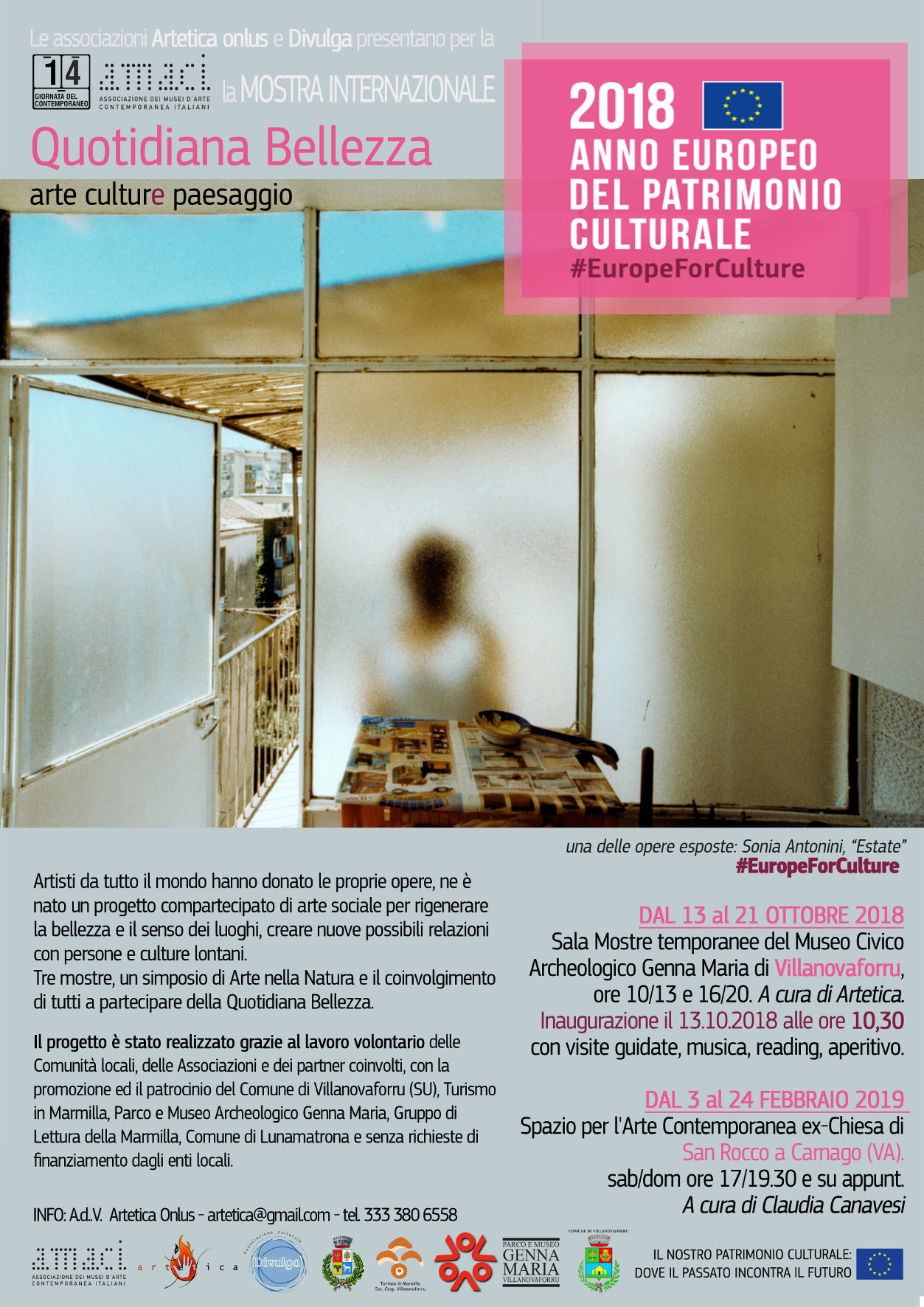 L’associazione di volontariato Artetica onlus e l’associazione culturale Divulga presentano, per la XIV Giornata del Contemporaneo AMACI, e all’interno delle manifestazioni del MiBACT per l’Anno Europeo del Patrimonio Culturale, la mostra internazionale QUOTIDIANA BELLEZZA – ARTE CULTURE PAESAGGIO.
