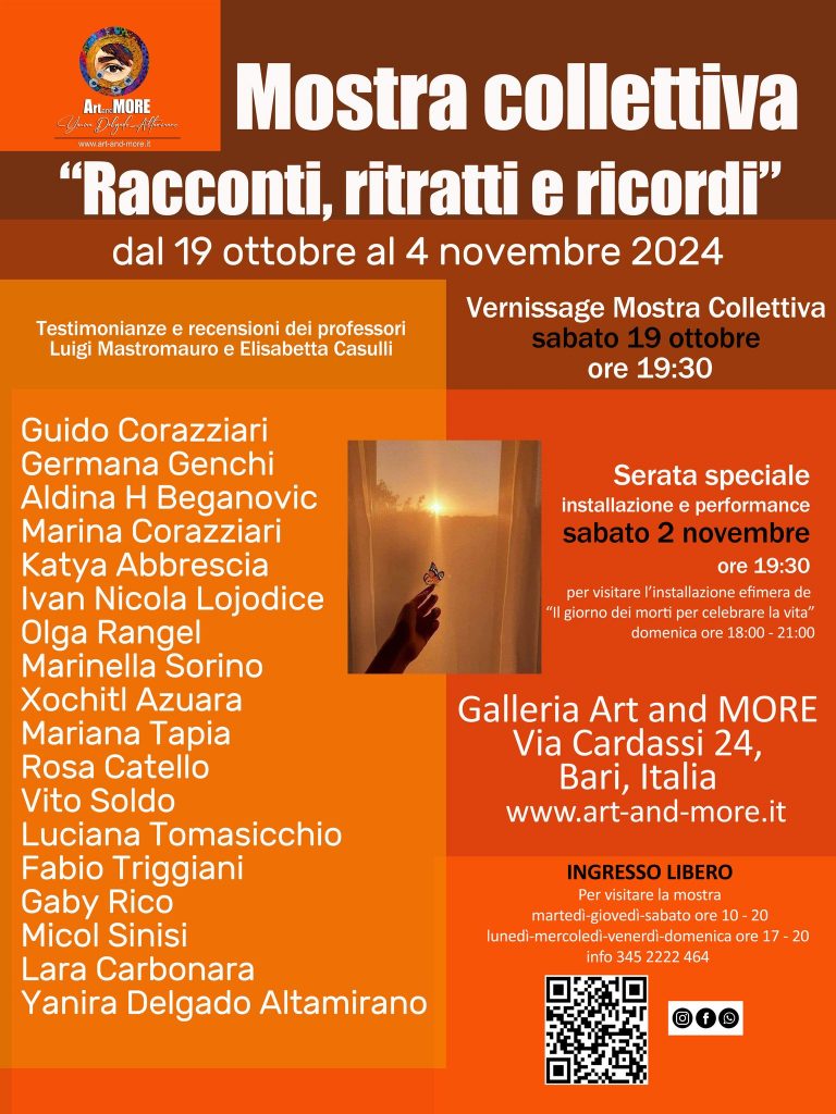 Dal 19 ottobre al 4 novembre 2024, presso la Galleria Art and MORE, in Via Cardassi 24 a Bari, si terrà la mostra collettiva "Racconti, ritratti e ricordi", un evento che celebra l'autunno attraverso le opere di 18 artisti di rilievo. Il vernissage è previsto per sabato 19 ottobre alle ore 19:30, con la partecipazione dei professori Luigi Mastromauro ed Elisabetta Casulli, che offriranno testimonianze e recensioni sulle opere in esposizione.