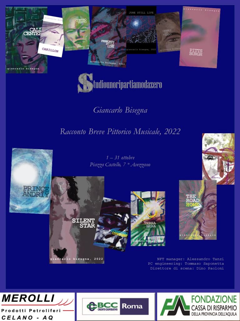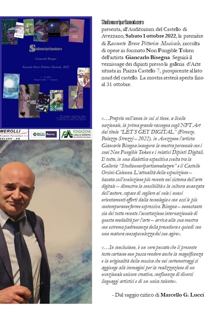 presenta, all’Auditorium del Castello di Avezzano, Sabato 1 ottobre 2022, la première di Racconto Breve Pittorico Musicale, raccolta di opere in formato Non Fungible Token dell’artista Giancarlo Bisegna. Seguirà il vernissage dei dipinti presso la galleria d’Arte situata in Piazza Castello 7, prospicente al lato nord del castello. La mostra resterà aperta fino al 31 ottobre.