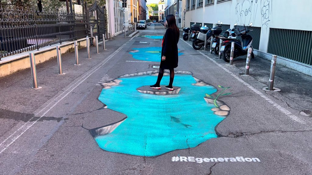 è stata presentata oggi, nella cornice della Milano Design Week, “Re-generation”, l’opera di street art anamorfica realizzata in zona Tortona, dall’artista Cosimo Caiffa, in arte “Cheone”, per ispirare il pubblico sul tema della sostenibilità ambientale.