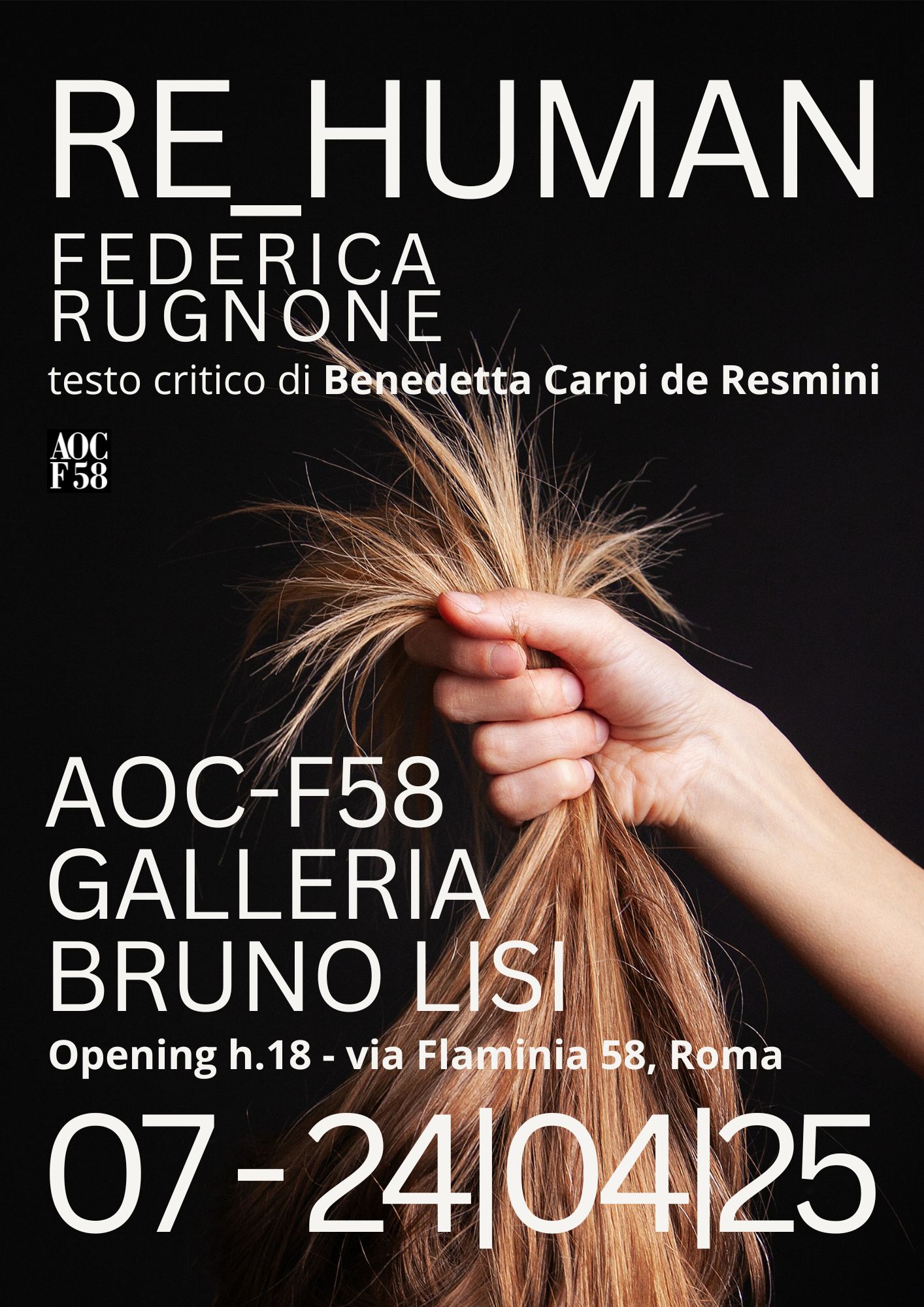 La mostra personale di Federica Rugnone Re_Human si inaugurerà il prossimo 7 aprile alle ore 18 alla AOC F58 - Galleria Bruno Lisi. La personale, accompagnata dal testo di Benedetta Carpi de Resmini, sarà visitabile fino al 24 aprile.
