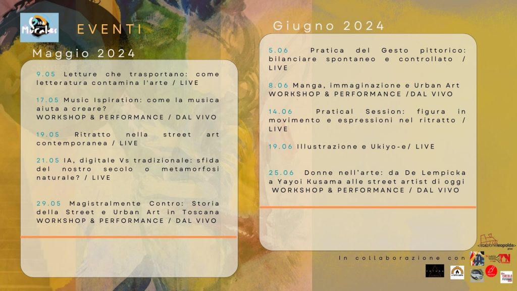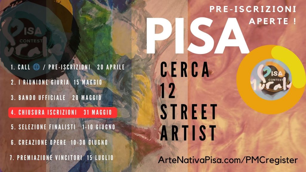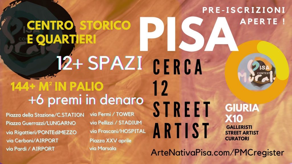 Tra 10 e 30 giugno performance murali e pittoriche, seguiremo le creazioni dei 12 finalisti dal vivo: vi piaceranno, venite a farci visita nelle location e orari da scoprire su artenativapisa.com/PisaMuralesContest.