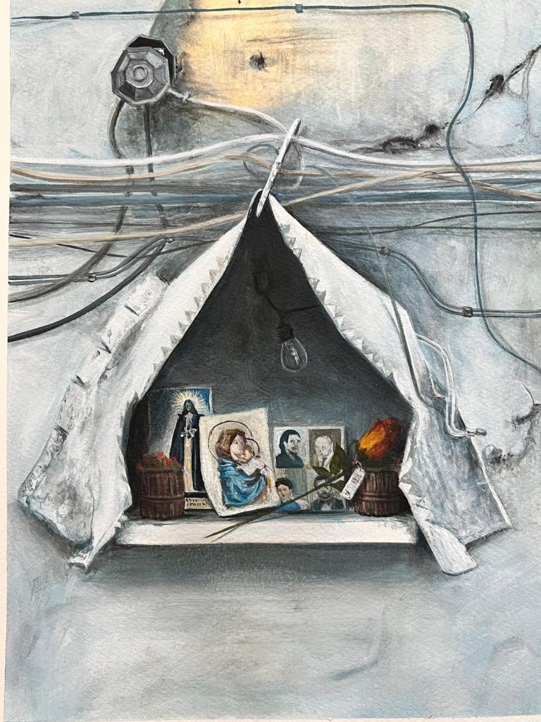 Allestita nella galleria Spazio Amira aps di Nola(NA), la mostra Retablos urbani e familiari / Chi cade ha le ali di Mariana Sofia Gonzalez a cura di Vittorio Avella e Antonio Sgambati, esplora attraverso opere pittoriche e in ceramiche la sua idea di retablo come luogo di resistenza e trasformazione.