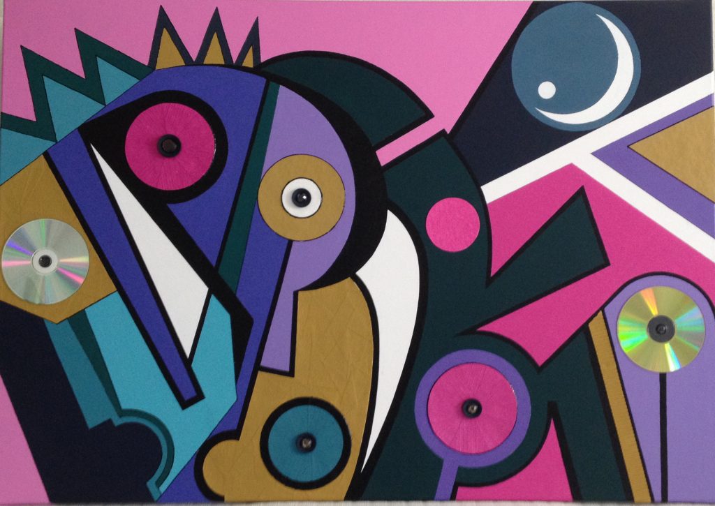 La sua linea, studiata nella combinata alternanza di rigidi segmenti e secche spezzature d’angoli, corre alle immagini come a contornare, netta e perentoria, forme inesorabili, incise talvolta con la lenta crudeltà di una lama, talvolta con il deciso fendente di una spada. La sequenza dei segmenti di retta separa via via spazi e oggetti, e di regola nel suo percorso spezzato rivela figure, quasi volti inumani, dove alla linea curva è solo permesso di apparire nel cerchio argenteo di un compact disc applicato a collage in funzione fissa di grande pupilla ferma e dilatata: per ansioso sgomento, non per meraviglia (il laser infatti ne ha ferito per sempre la rilucente superficie metallica, corrompendola di informazioni destinate all’oblio).