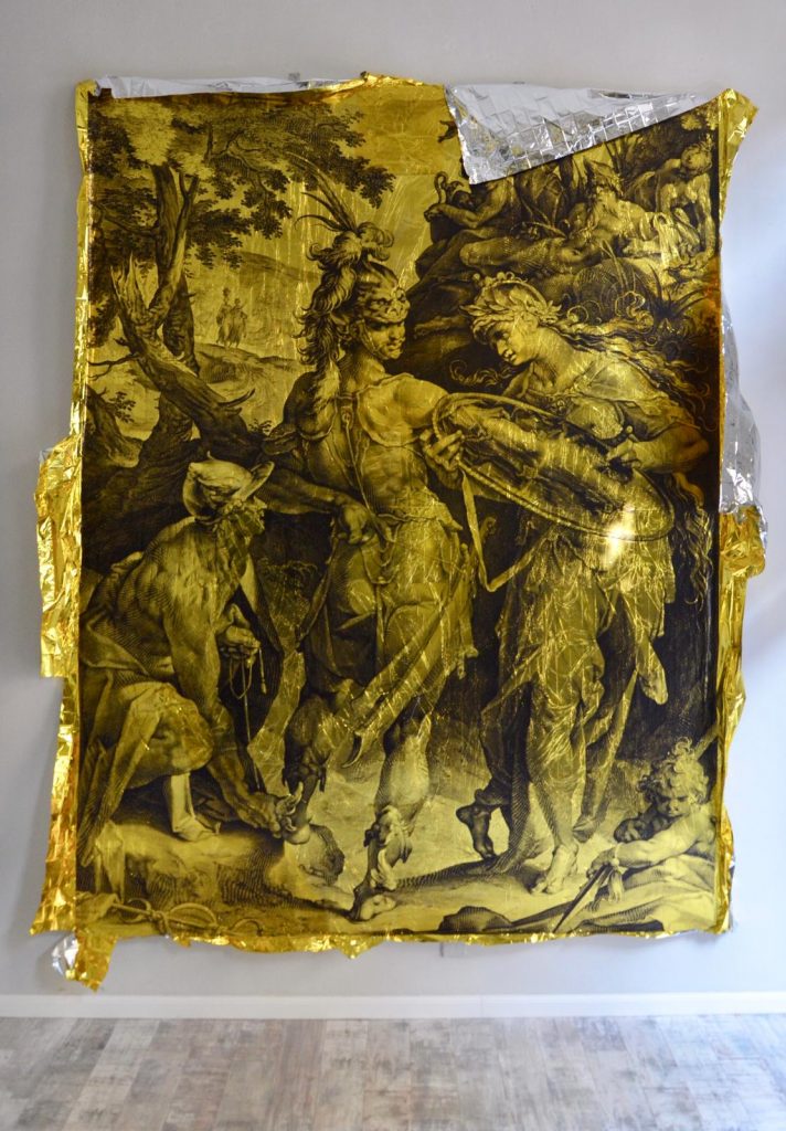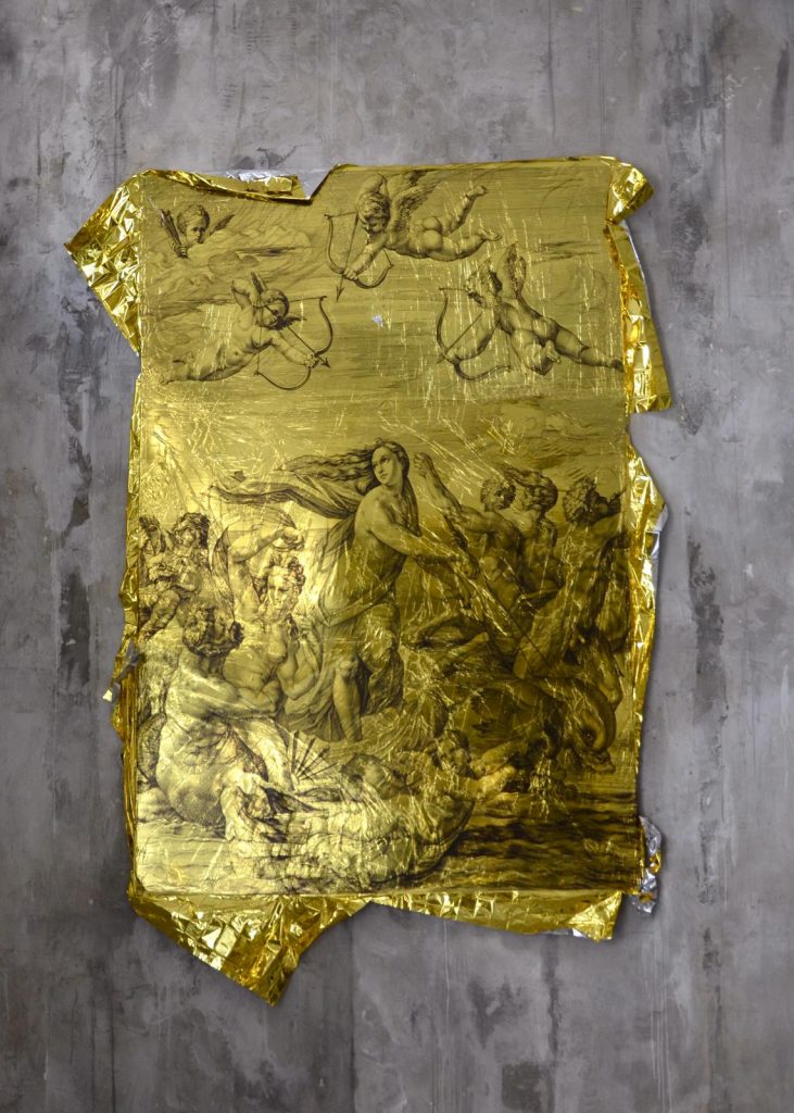 Visivamente l’installazione si presenta come un accumulo di coperte isotermiche sospese, un serpente dorato che si snoda per la lunghezza dello spazio espositivo sino alla sua origine: una videoproiezione di pochi secondi del volto di Balla. Un sovrapporsi di sensazioni che in pochi istanti suscita l’empatia dello spettatore nei confronti del ragazzo.