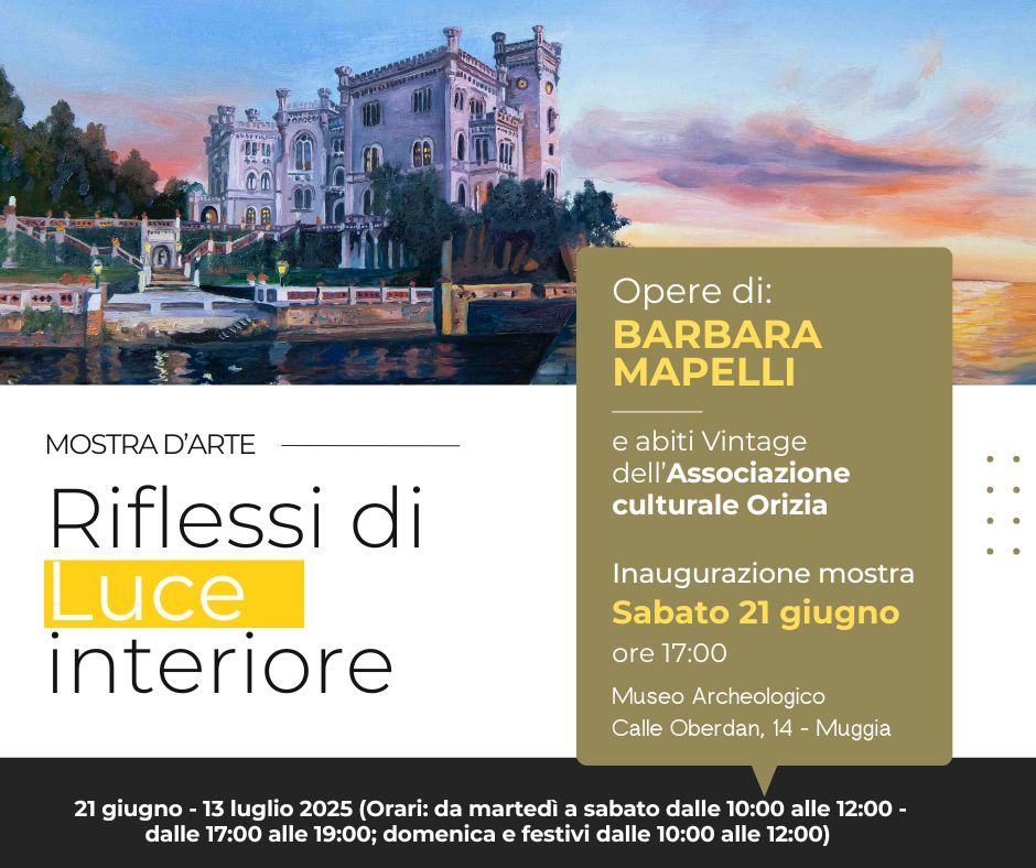 Sabato 21 giugno, alle ore 17:00, presso il Museo Archeologico di Muggia (Calle Oberdan 14 - Casa Veneta), si terrà l'inaugurazione della mostra personale, ”Riflessi di luce interiore", dell’artista e pittrice Barbara Mapelli. L’evento, promosso dal Comune di Muggia - Assessorato alla Cultura, rappresenta un’opportunità unica per immergersi in un dialogo tra arte visiva e moda, alla scoperta della bellezza nascosta nella luce interiore.