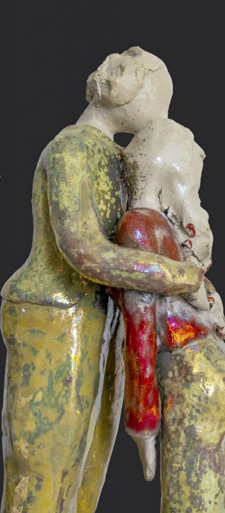 Con una selezione di sculture in ceramica, l’artista esplora il senso di sospensione del tempo vissuto durante il periodo del lockdown ed il rinnovato equilibrio della nuova realtà, fermata attraverso la rappresentazione di gesti quotidiani. Protagoniste le figure, prevalentemente femminili, dalle forme morbide e rassicuranti, da tempo indagate dall’artista, colte in attimi di solitudine, nel chiuso dei propri universi esistenziali, ma illuminati dalla lettura, dalla compagnia di animali domestici, rasserenati dalla potente energia di un abbraccio.