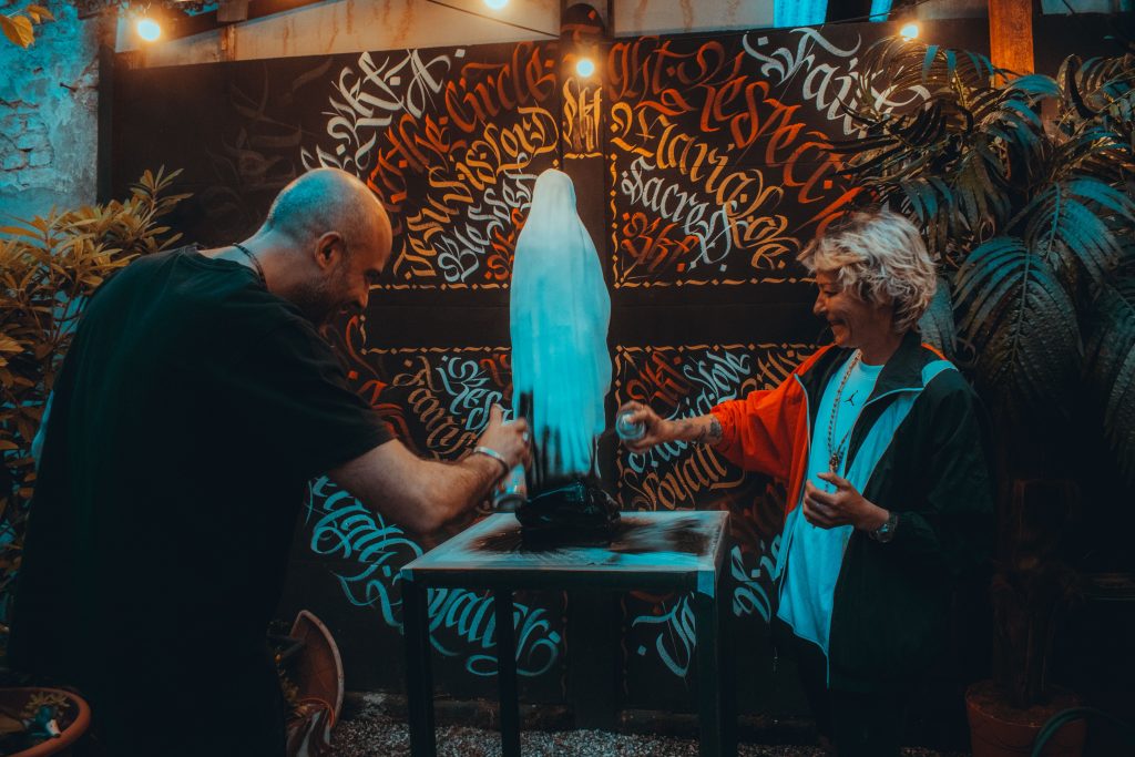 RKF-Honorfarm è una realtà artigianale, italiana, che nasce dalle mani di Vanessa e Ilario: due amanti della vita che dalla pandemia hanno guadagnato il tempo per scoprire e far crescere la loro passione sfociata in un’espressione artistica unica ed originale. L’attrazione per i simboli, le icone religiose e l’arte sacra si è riversata in una giusta miscela colata in uno stampo professionale della Madonna Orante, regalo di Lallo ad aprile 2019, da cui si è sviluppato un progetto estremamente contemporaneo aperto a contaminazioni artistiche e culturali che amplifica l’esperienza della vita quotidiana.