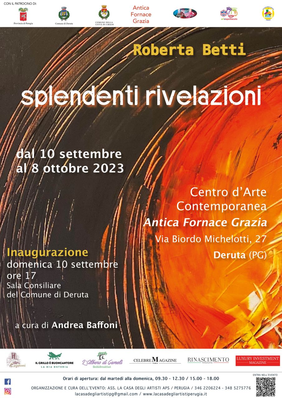 Deruta presenta l’opera dell’artista Roberta Betti con una mostra visitabile, dal 10 settembre-8 ottobre 2023, presso i prestigiosi spazi del Centro d’Arte Contemporanea Antica Fornace Grazia di Deruta. L’esposizione, dal tiolo “Splendenti rivelazioni”, è un tributo alla forza della pittura come “luogo” attraverso cui manifestare le proprie emozioni e si riallaccia alle precedenti esperienze espositive portate avanti dall’artista in Italia e all’Estero.