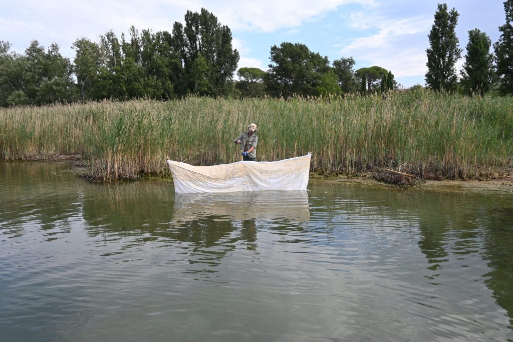 L’impronta dell’acqua ha l’obiettivo di introdurre nuove forme di progettazione, nuove modalità di produzione scientifica e artistica, nuovi linguaggi liberi e innovativi per parlare del lago Trasimeno. Una mostra e un progetto complesso che intendono restituire una riflessione sulla rappresentazione paesaggistica e delle sue componenti biologiche e naturali attraverso la sinergia tra la pratica dell’artista, lo studio scientifico-biologico dell’Agenzia Regionale per la Protezione dell’Ambiente – Arpa Umbria – e la rilettura dell’azione in chiave artistica delle pratiche di produzione e rappresentazioni di Roberto Ghezzi.